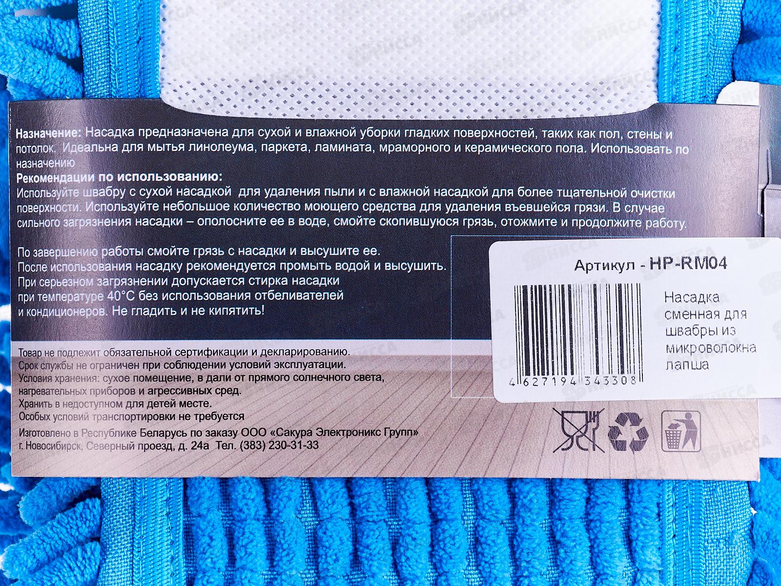 Размеры: 41х12 см; материал: полиэстер. Накладка «Лапша» изготавливается из плотной микрофибры, обладающей великолепной впитываемостью. При этом использование этого материала исключает вероятность механического повреждения напольного покрытия. Предназначена для уборки любого вида твердых напольных покрытий керамической плитки и ламината, паркета или линолеума. В сухом виде накладка соберет пыль, пух, волосы. Частички загрязнений притягиваются к насадке во время работы. Пыль не разлетается, держится в структуре ворса. Идеально подходит для владельцев домашних животных. Подходит для швабры: HP-M03, HP-M04