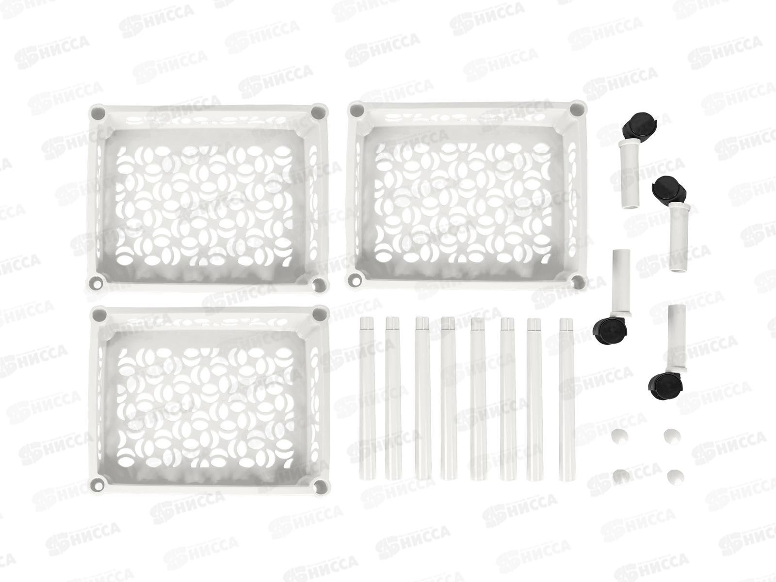 Габариты этажерки в собранном виде: 370х290х690 мм, она собирается без инструментов за несколько минут, достаточно соединить стойки и полки, вставить ножки и заглушки. Вместительные полки применяются для хранения большого количества хозяйственных мелочей. На нижних ножках предусмотрены колесики, ее легко выдвигать и устанавливать на место.