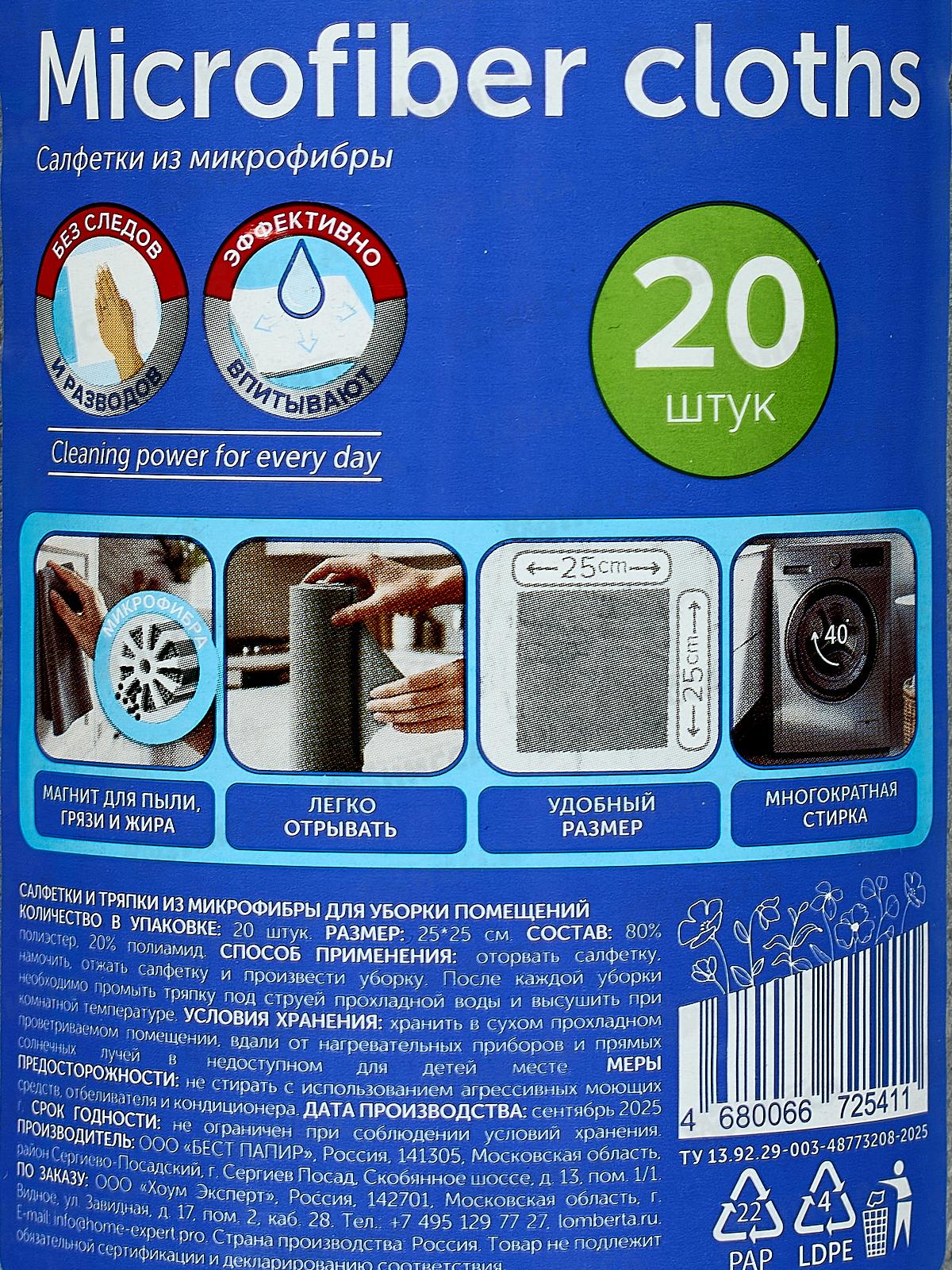 Салфетки Lomberta в рулоне из микрофибры 20 листов микс цветов 725411 *8