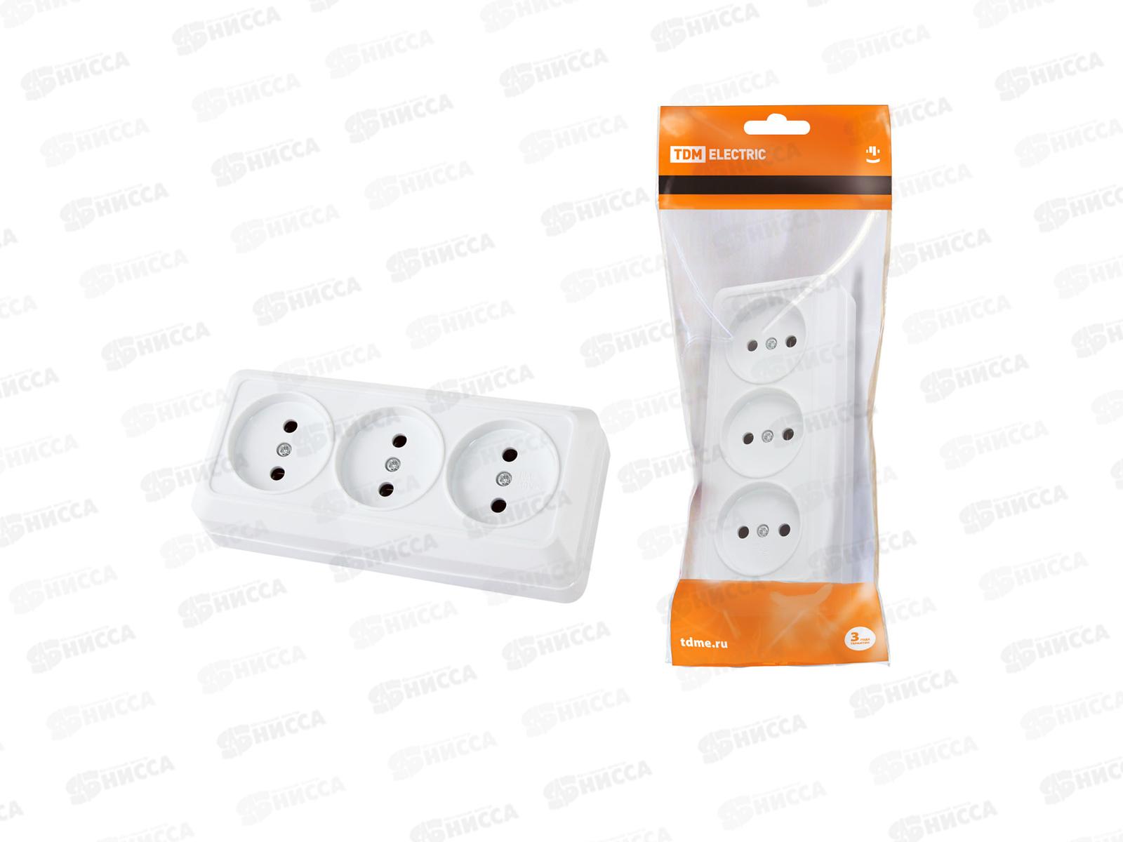 Розетка 3-х местная горизонтальная 2П открытой установки IP20 10A с з/ш белая "Ладога", TDM *6