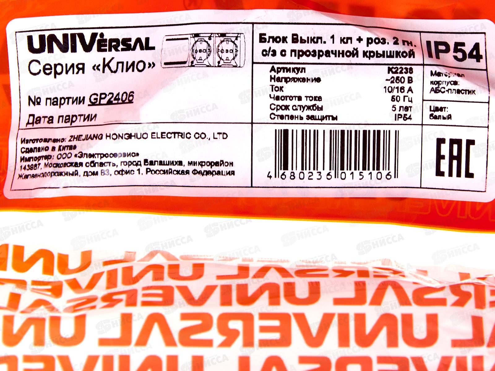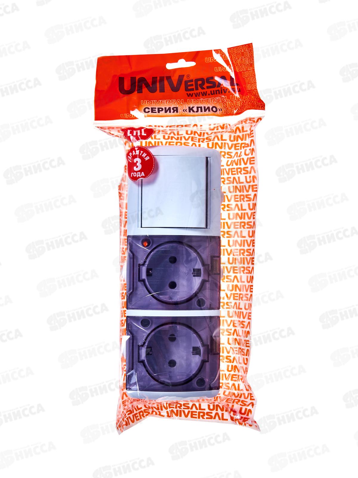 Блок горизонтальный КЛИО выкл. 1-кл, о/у + розетка 2-мес.с крышкой, с/з, 16А*10