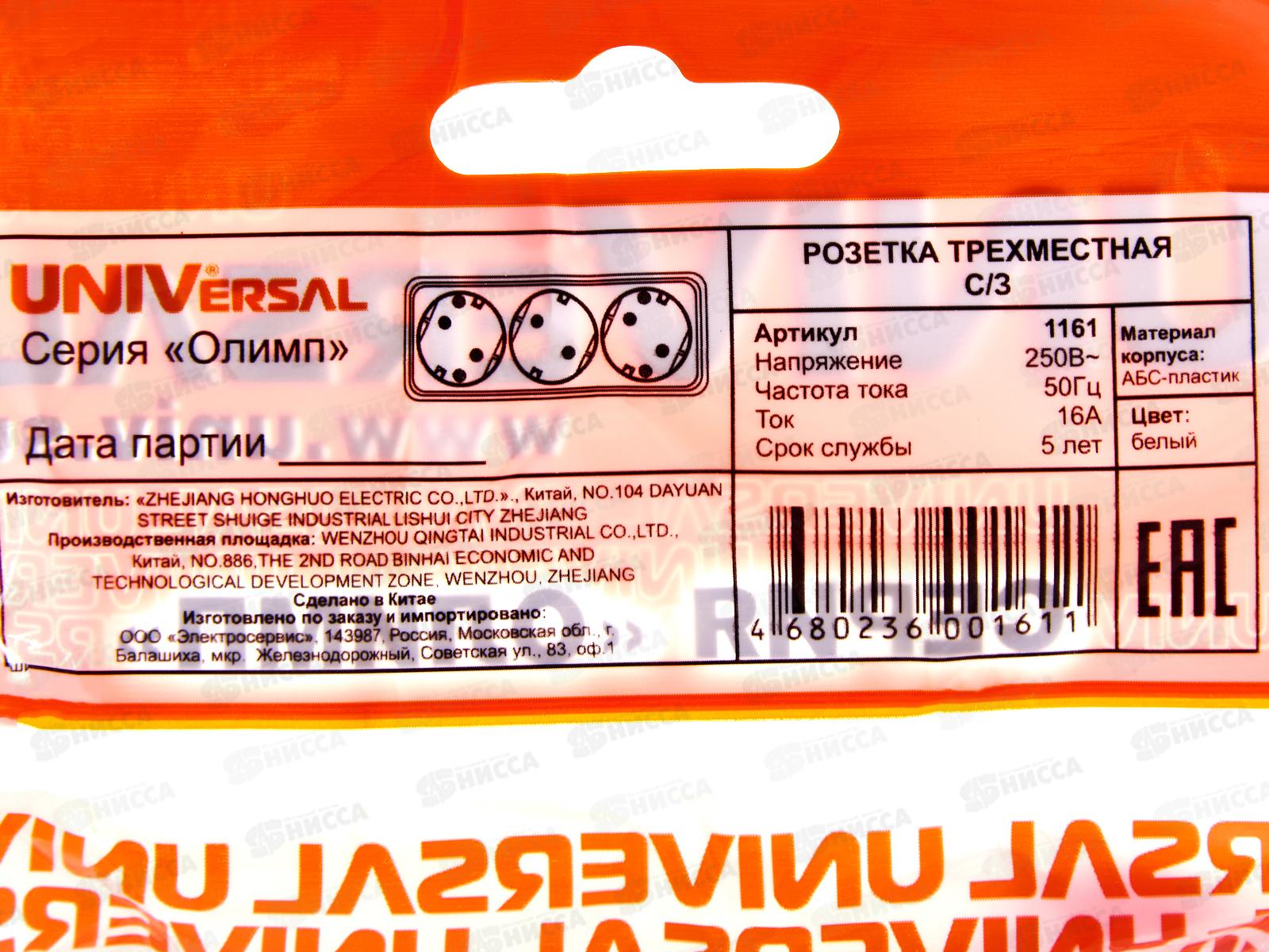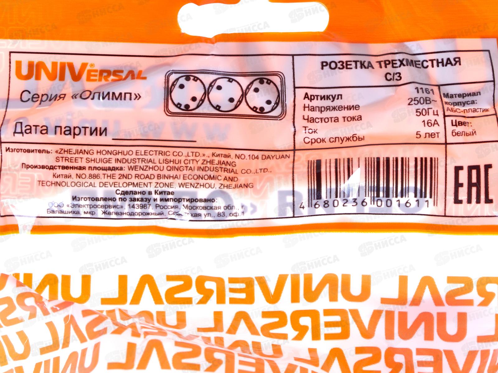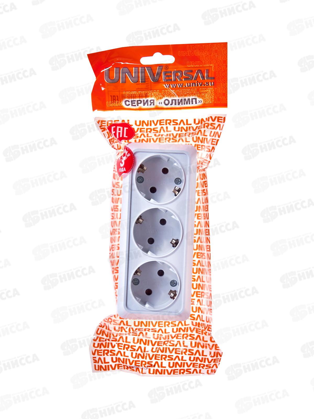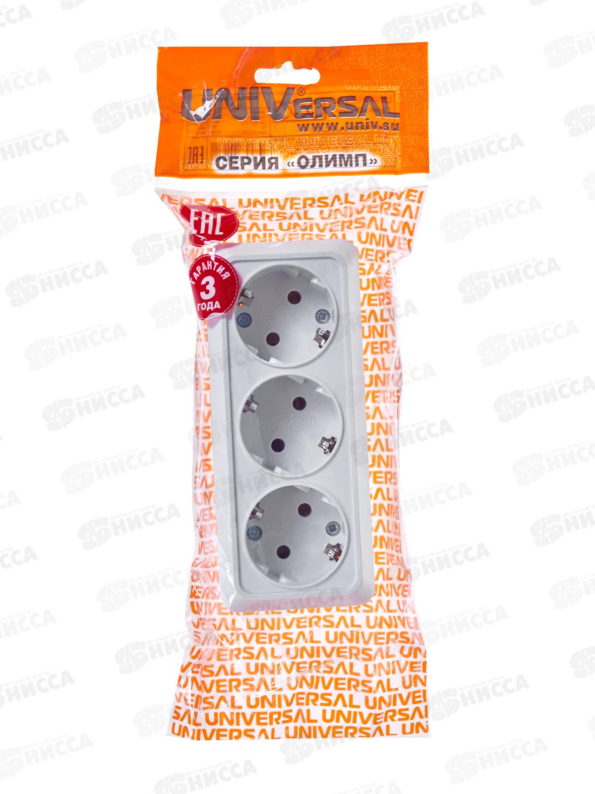 Розетка ОЛИМП 3-местная открытой установки, с заземлением, 16А, 220В белая,керамика,1161*10