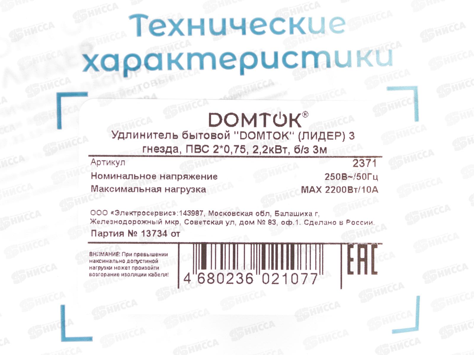 Удлинитель бытовой DOMTOK 2,2кВТ 3 гнезда ПВС 2*0,75, б/з, 3м, 2371