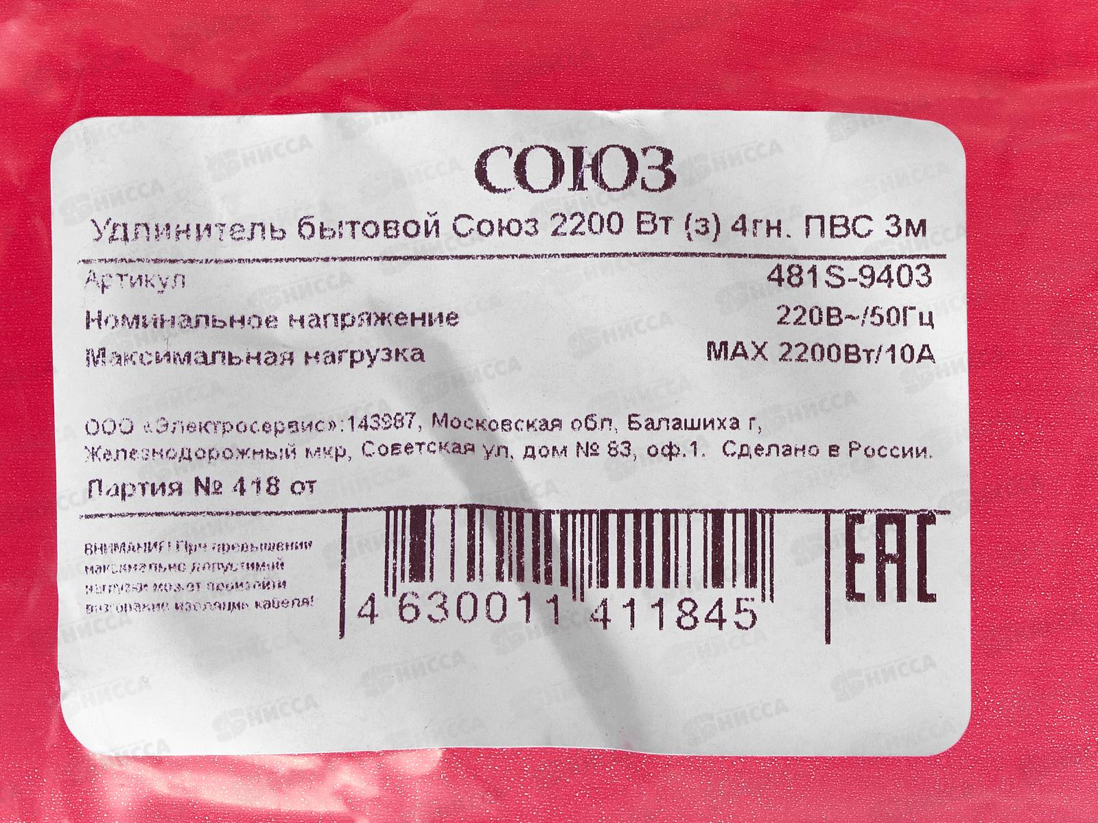 Удлинитель бытово СОЮЗ 2200ВТ 4гн. ПВС , с заземлением, 3м, 481S-9403