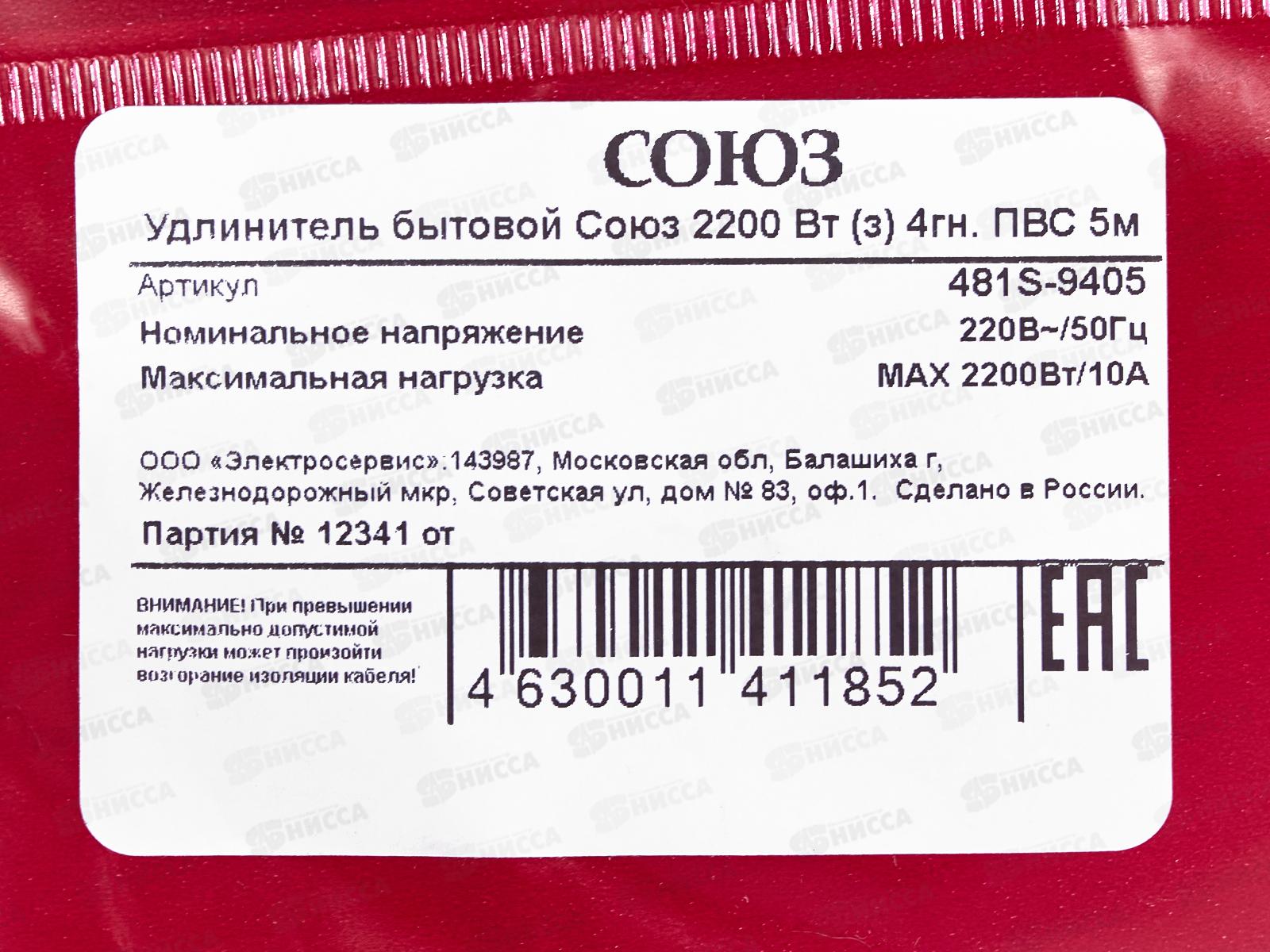 Удлинитель бытово СОЮЗ 2200ВТ 4 гнезда. ПВС , с заземлением, 5м, 481S-9405