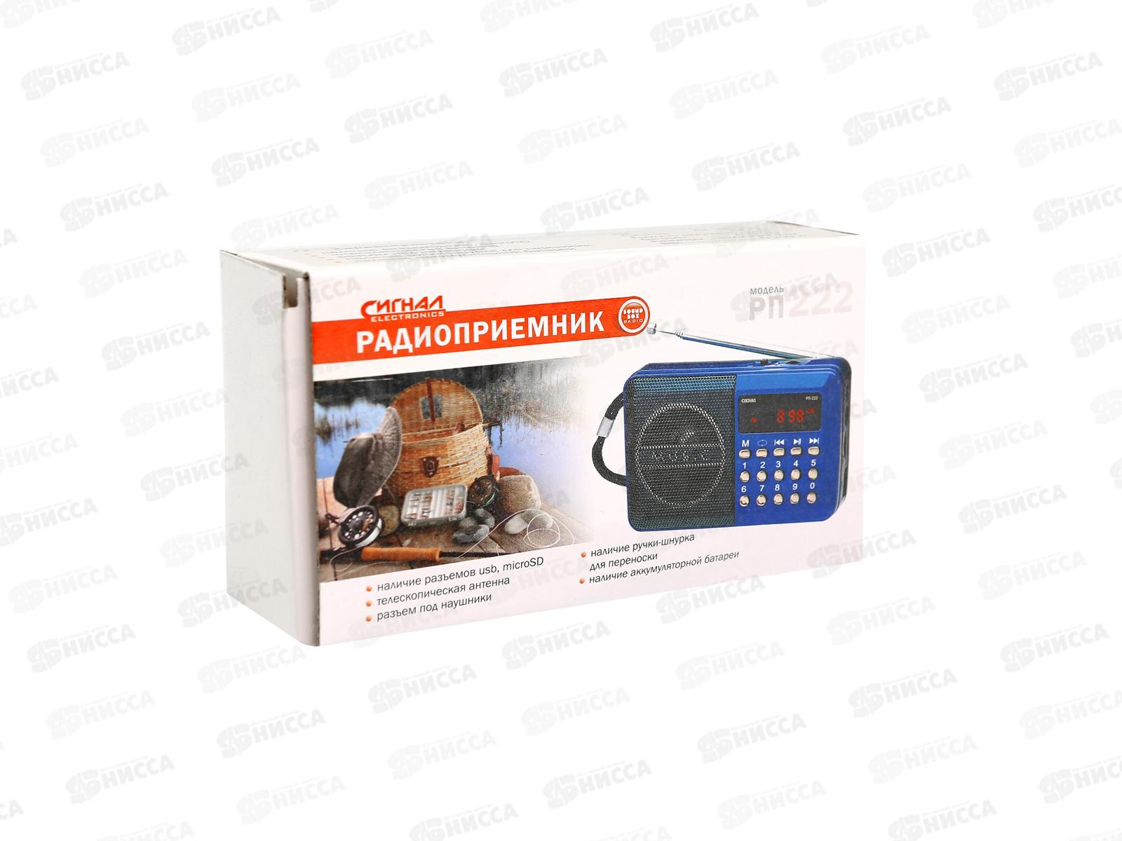 Радиоприемник имеет цифровой тюнер, обеспечивает сигнал в УКВ диапазоне с частотой 88-108МГц. Преимуществом цифрового тюнера является возможность автопоиска радиостанций. У РП-222 присутствует 1 динамик мощностью 3W, питание радиоприемника осуществляется от сети 220В, через блок питания 5В (не в комплекте). Также имеются следующие удобства для его эксплуатации: дисплей, телескопическая антенна, наличие слотов под USB, microSD карты, разъем под наушники и ручка шнур для переноски. В комплектацию радиоприемника входит: само устройство, шнурок, USB шнур, инструкция полностью на русском языке, цветная упаковка и гарантийный талон.