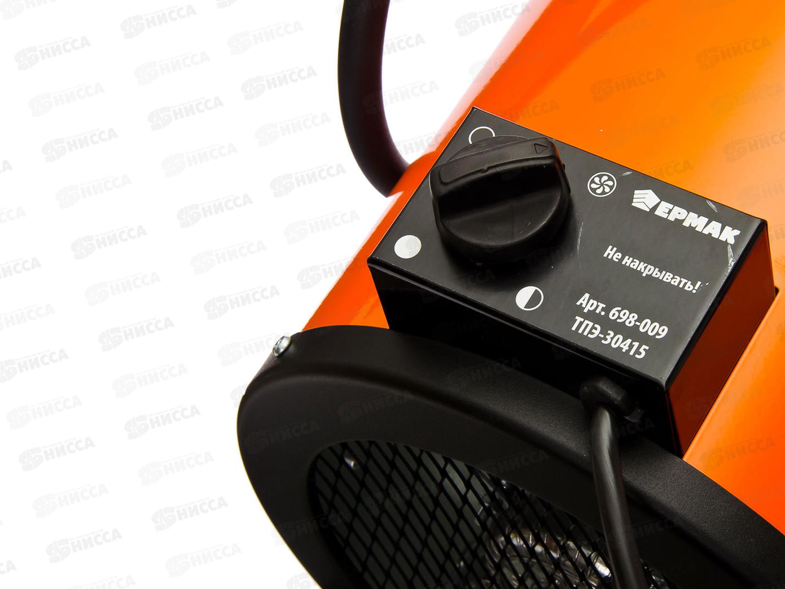 Тепловая пушка электрическая ЕРМАК 3 кВт с термозащитой обеспечивает быстрый и эффективный прогрев воздуха производительностью 280 кубических метров в час. Современный керамический нагревательный элемент имеет наиболее высокий КПД по сравнению со спиральными и тэновыми моделями. Оснащена удобной ручкой для переноски и имеет компактный размер, поэтому поместится даже в небольшом помещении. Возможность изменения угла наклона позволяет направить поток воздуха в нужное место. Подходит для обогрева теплиц, гаражей, жилых, производственных и складских помещений.