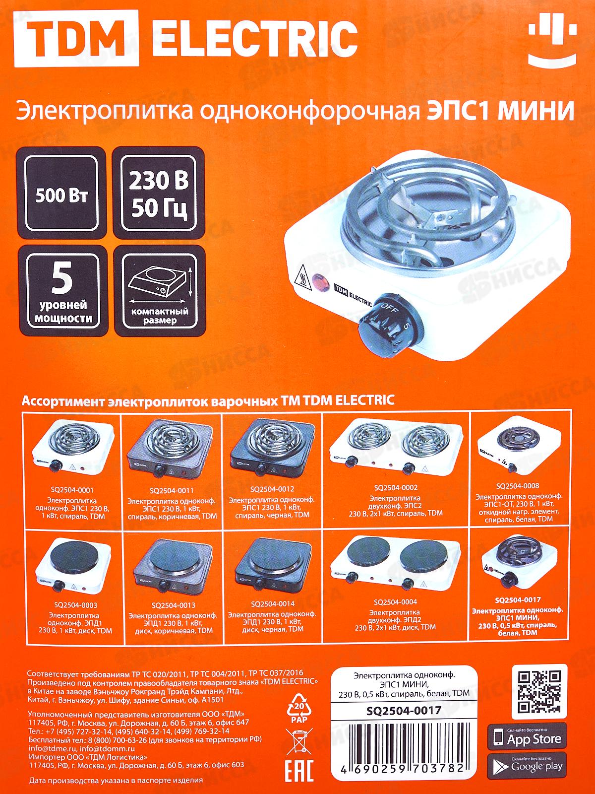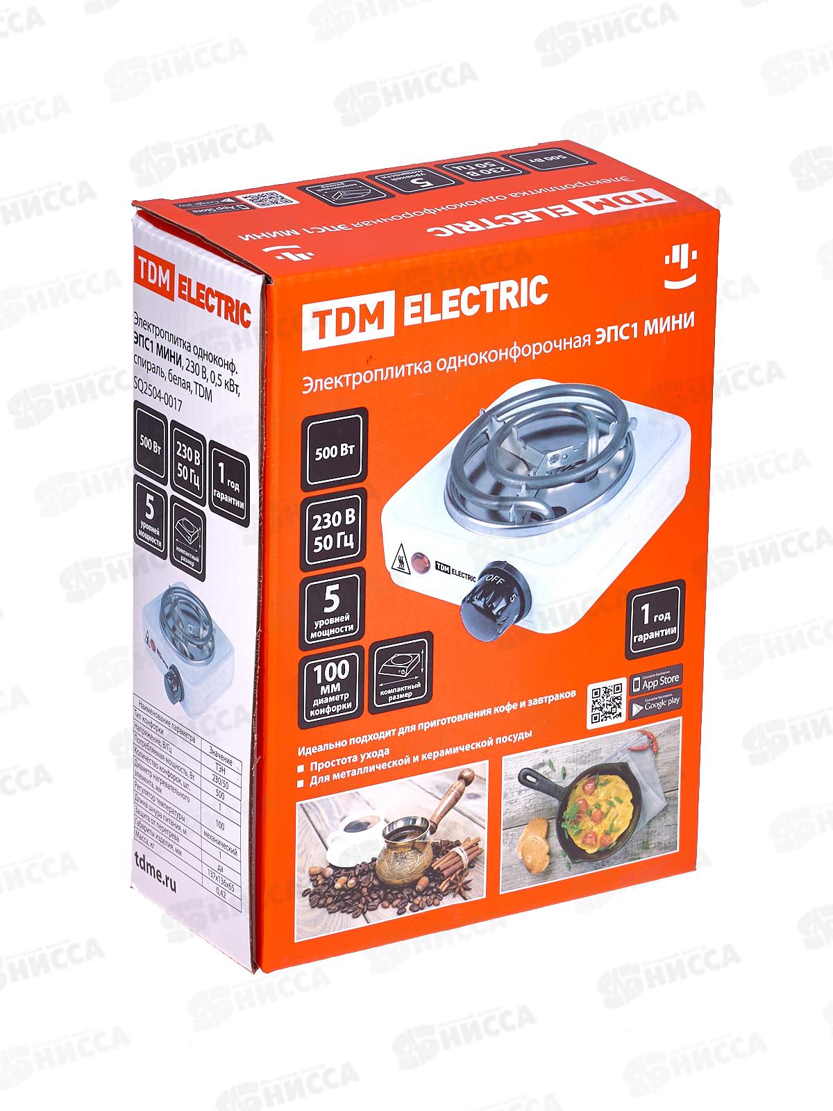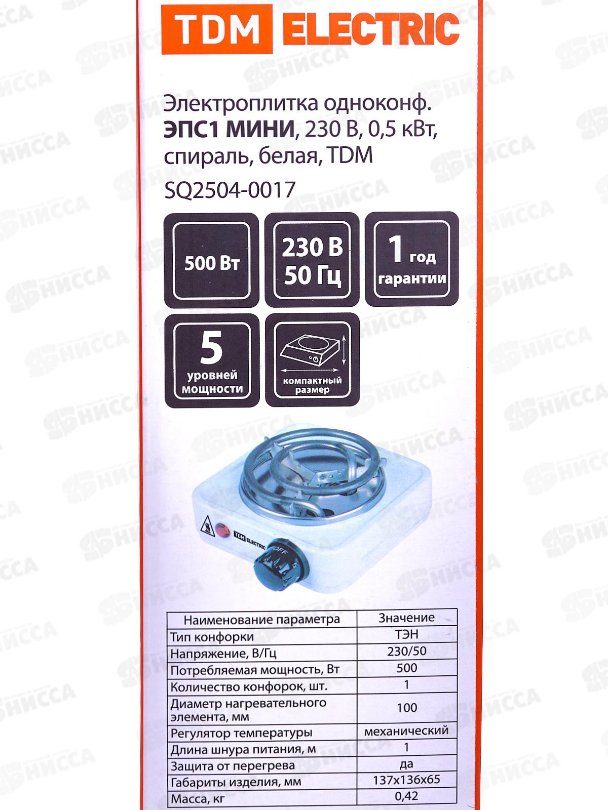 Плита электрическая одноконфорочная ЭПС1 мини 0,5кВт спираль, белая, TDM, 0017