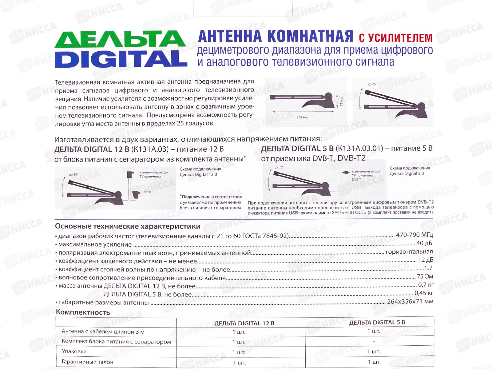 Антенна комнатная ДМВ активная Дельта К 131A.03 (12В, кабель 3м, до 40дБ) блок питания