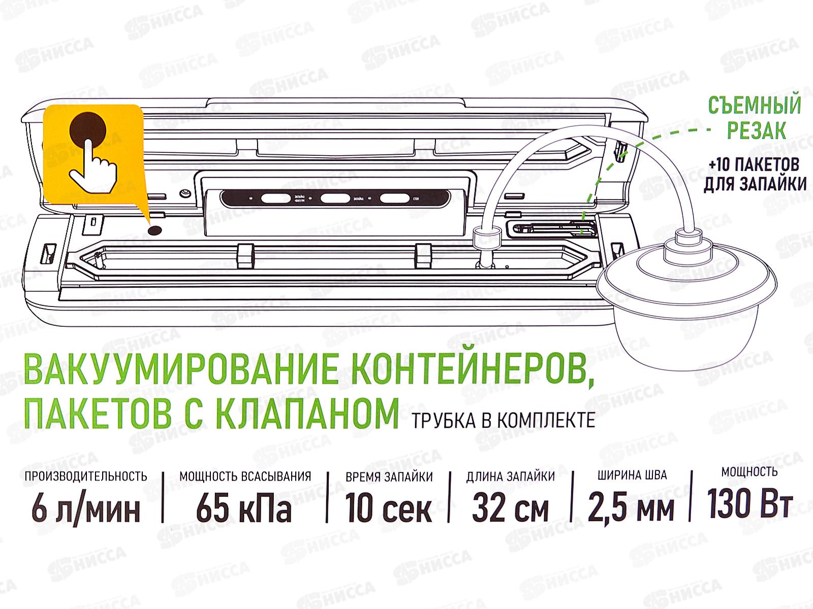 Комплект аксессуаров: вакуумный пакет 12х20 см (5 шт), вакуумный пакет 20х25 см (5 шт), нож для пакетов, трубка.