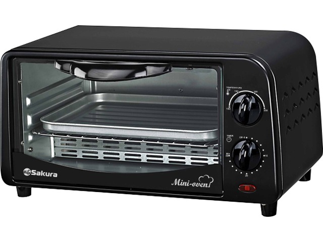 Регулировка температуры 100-250 С, 30-минутный таймер со звонком, световой индикатор работы, решетка с противнем выдвигаются при открытии дверцы.