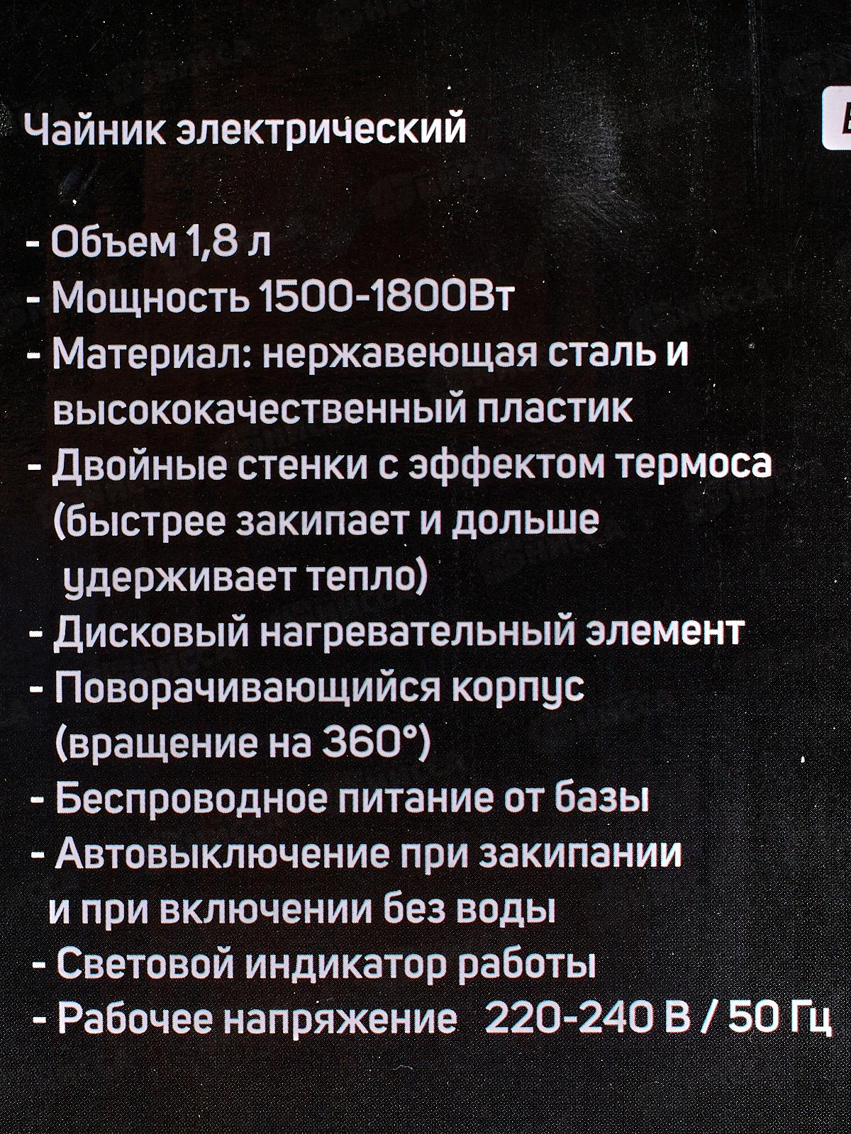 1.8 л, 1500-1800Вт, дисковый нагревательный элемент, двухслойный корпус, эффект термоса (быстрее нагревается и дольше удерживает тепло), отключение при закипании/без воды, световой индикатор работы, внутренний индикатор уровня воды, вращение на 360°. Цве