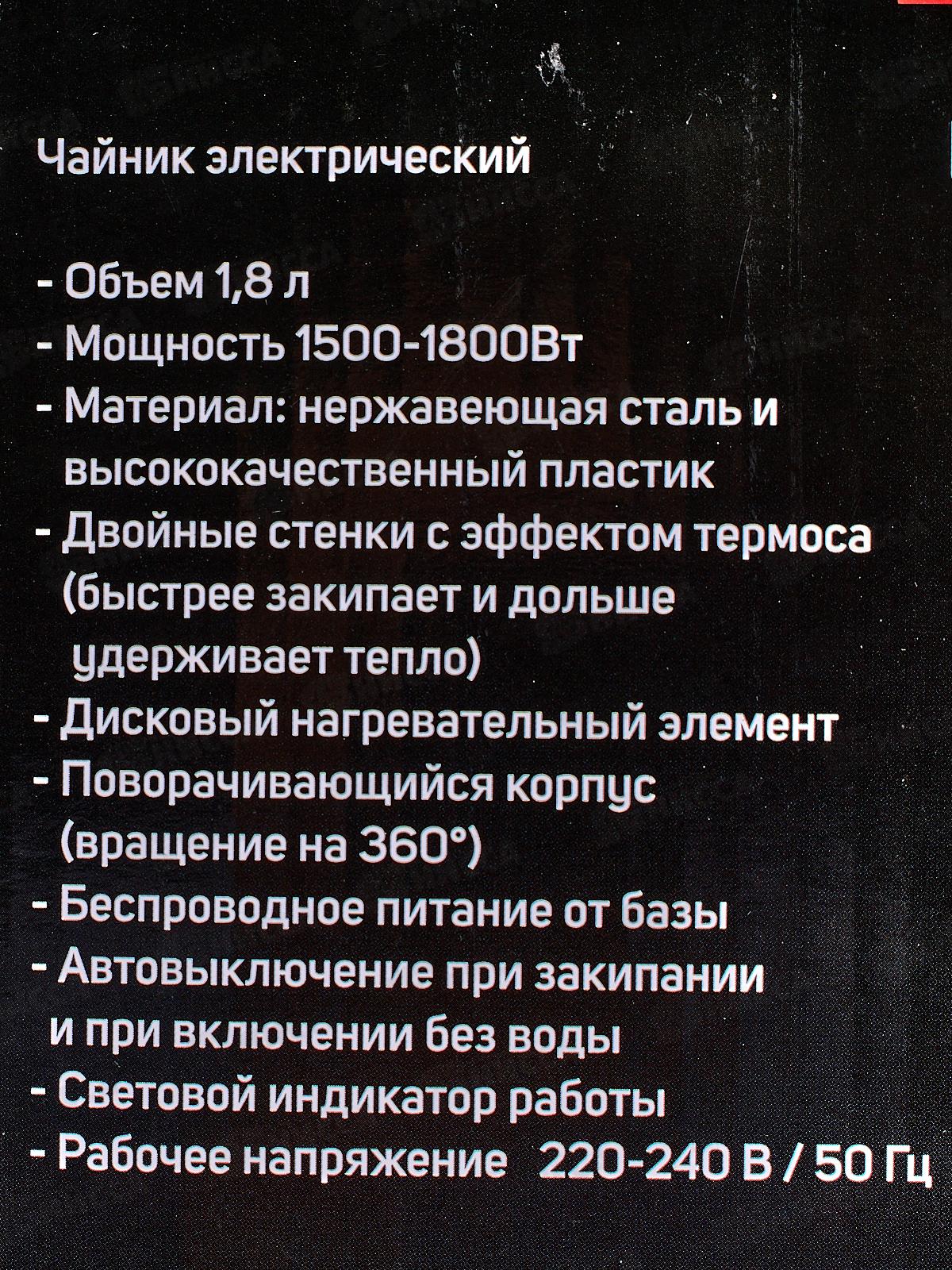 1.8 л, 1500-1800Вт, дисковый нагревательный элемент, двухслойный корпус, эффект термоса (быстрее нагревается и дольше удерживает тепло), отключение при закипании/без воды, световой индикатор работы, внутренний индикатор уровня воды, вращение на 360°. Цве