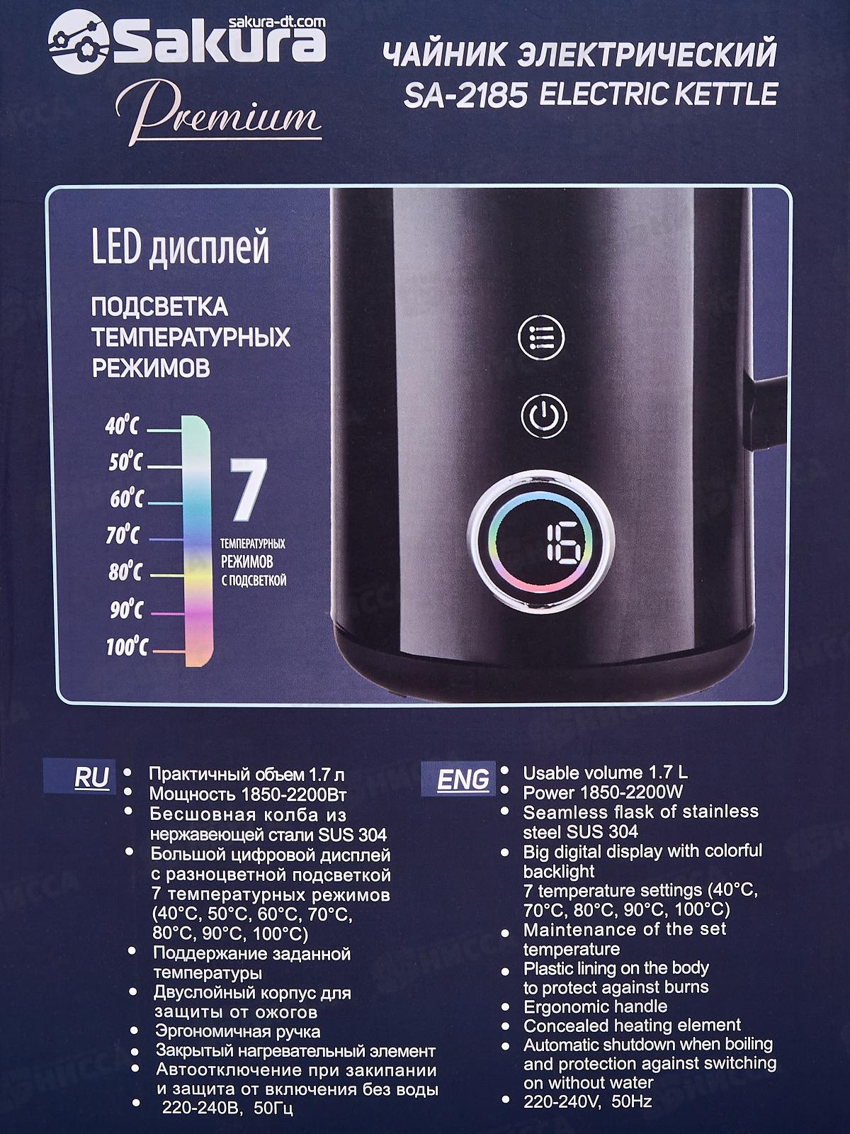 1.7 л, 1850-2200 Вт, закрытый дисковый нагревательный элемент, двухслойный корпус, бесшовная колба из нержавеющей стали SUS304, сенсорное управление, большой дисплей, 7 режимов (40°C, 50°C, 60°C, 70°C, 80°C, 90°C, 100°C), поддержание температуры, индика