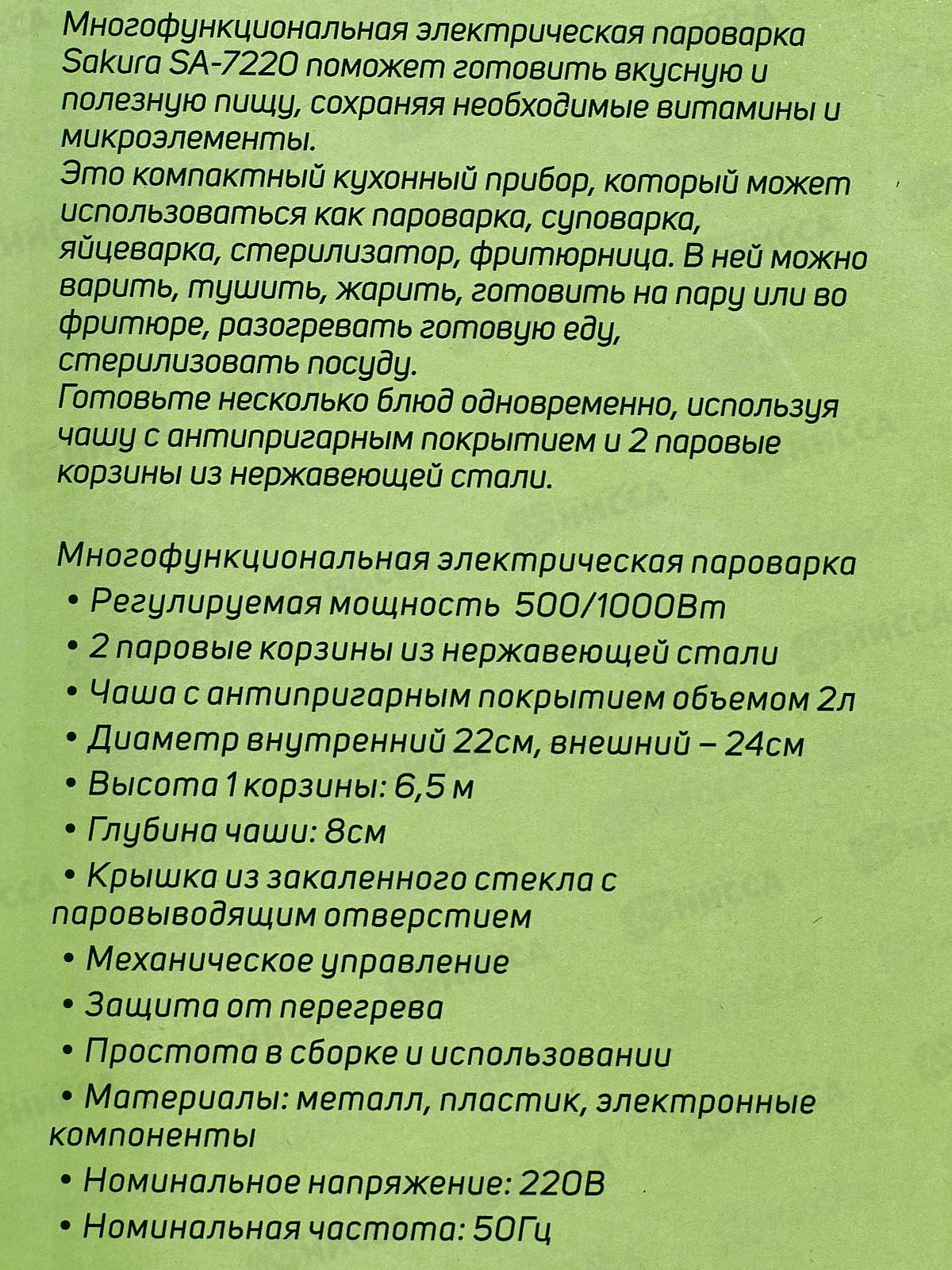 Пароварка SA-7220GR 8в1 2ч 1000Вт зеленая