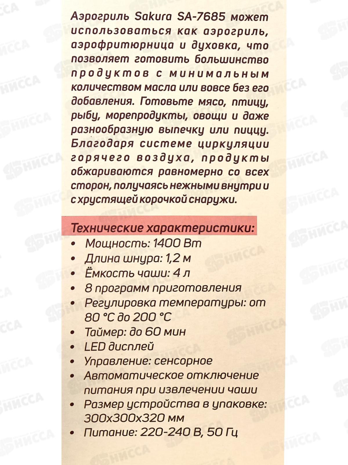 Аэрогриль SA-7685BK 4л таймер сенс управление