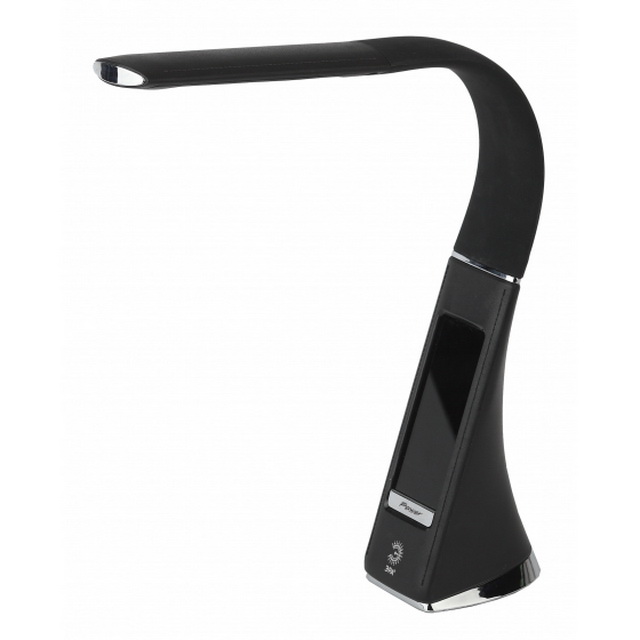 Настольный светильник ЭРА NLED-461-7W-BK со светодиодами (LED) в качестве источников света в дизайне "под кожу". Оснащен сенсорным управлением, есть регулировки яркости освещения - 3 уровня. Главное преимущество светильника - ЖК дисплей с функциями часов, будильника, календаря и термометра. Сенсорная кнопка с обратной стороны стойки обеспечивает опцию выбора яркости дисплея с возможностью его выключения. Высота плафона регулируется гибкой стойкой, направление света регулируется поворотом плафона в любом направлении.