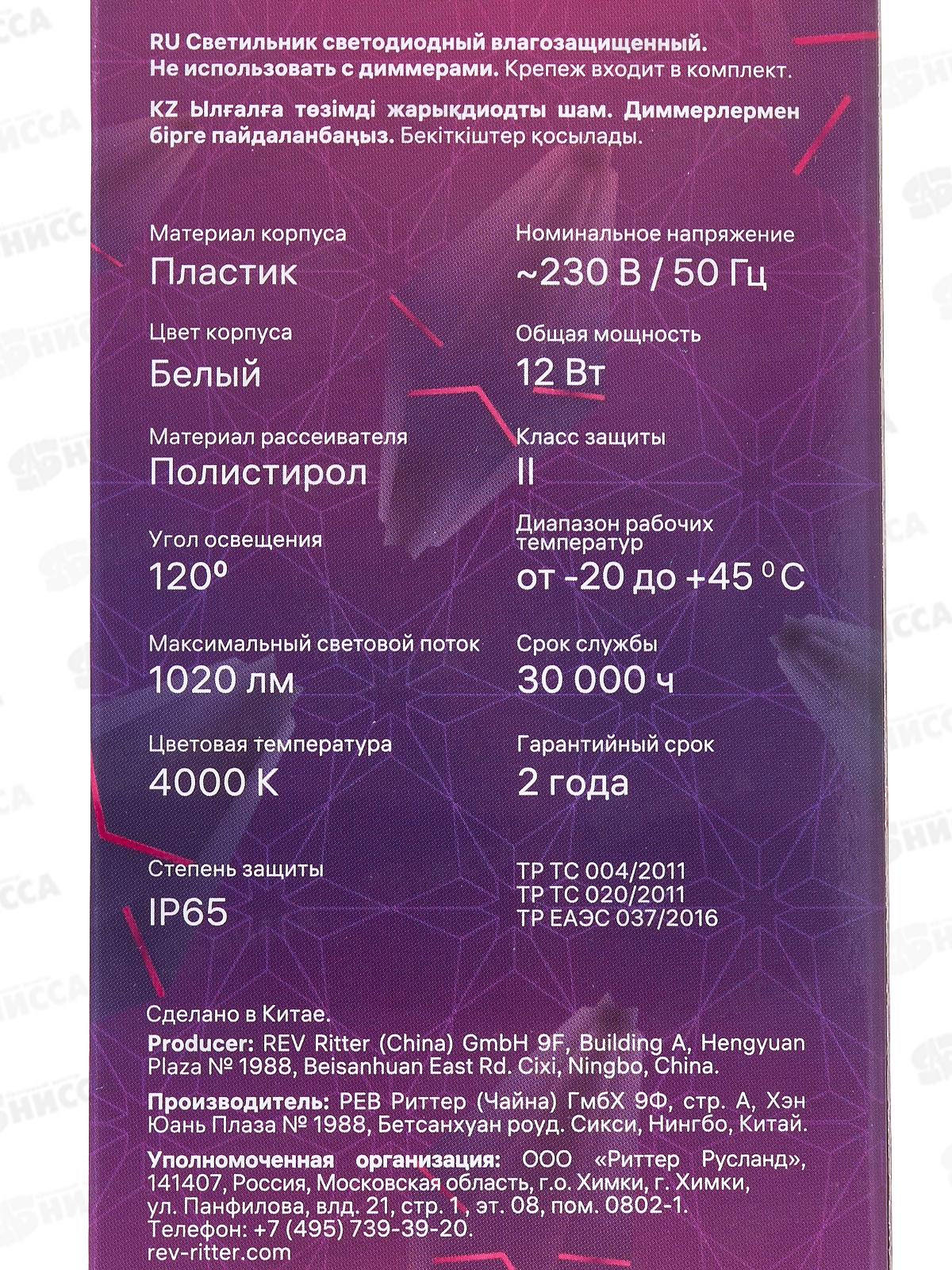 Светильник светодиодный REV Oval, 12Вт 4000K, овальный 168*70мм, IP65-влагозащищенный, 28921