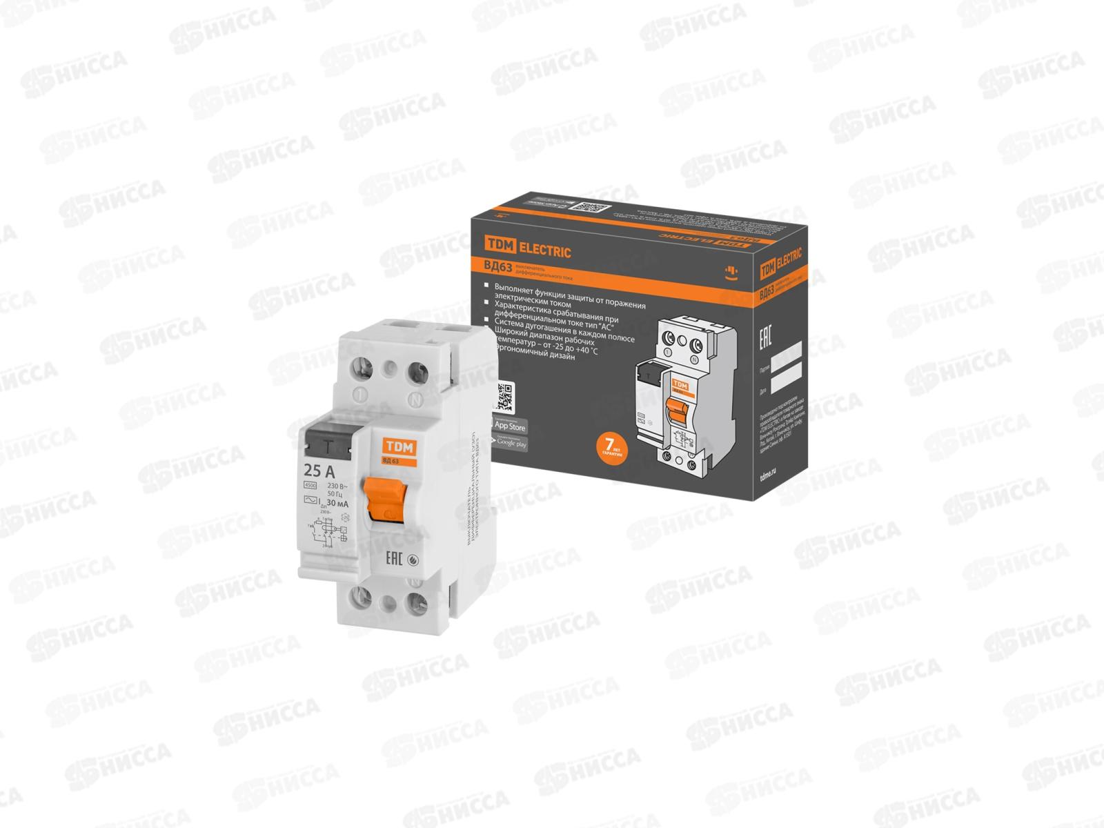 Устройство защитного отключения TDM ВД63 2Р 25 А 30 мА электронное SQ0220-0002 - низковольтный аппарат, который защищает объекты от возгорания, людей от поражения электрическим током при его утечке, а также оборудование от перегрева при повреждении изоляции.