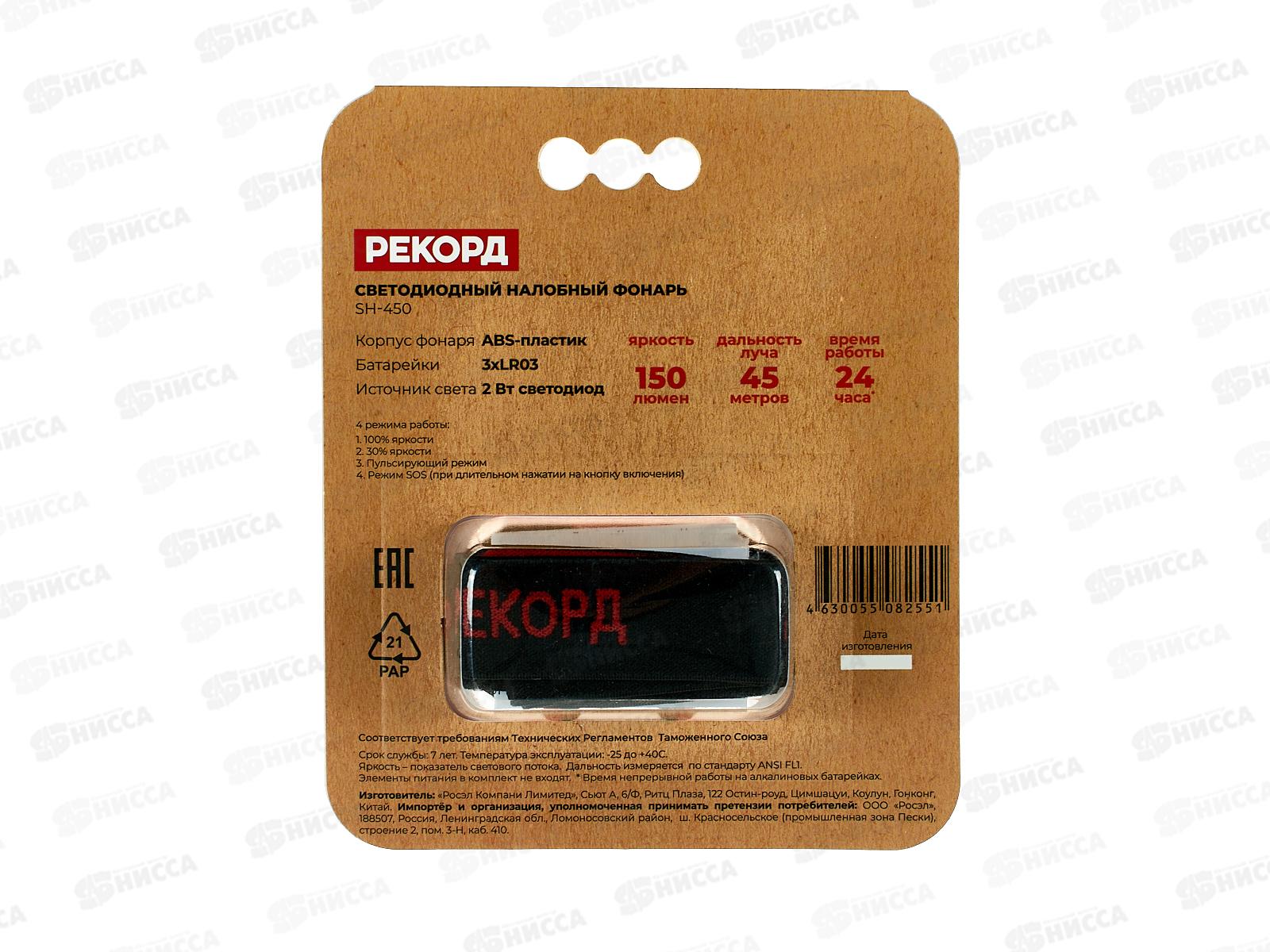 Фонарь РЕКОРД налобный (3*LR03), SH-450 *10/120