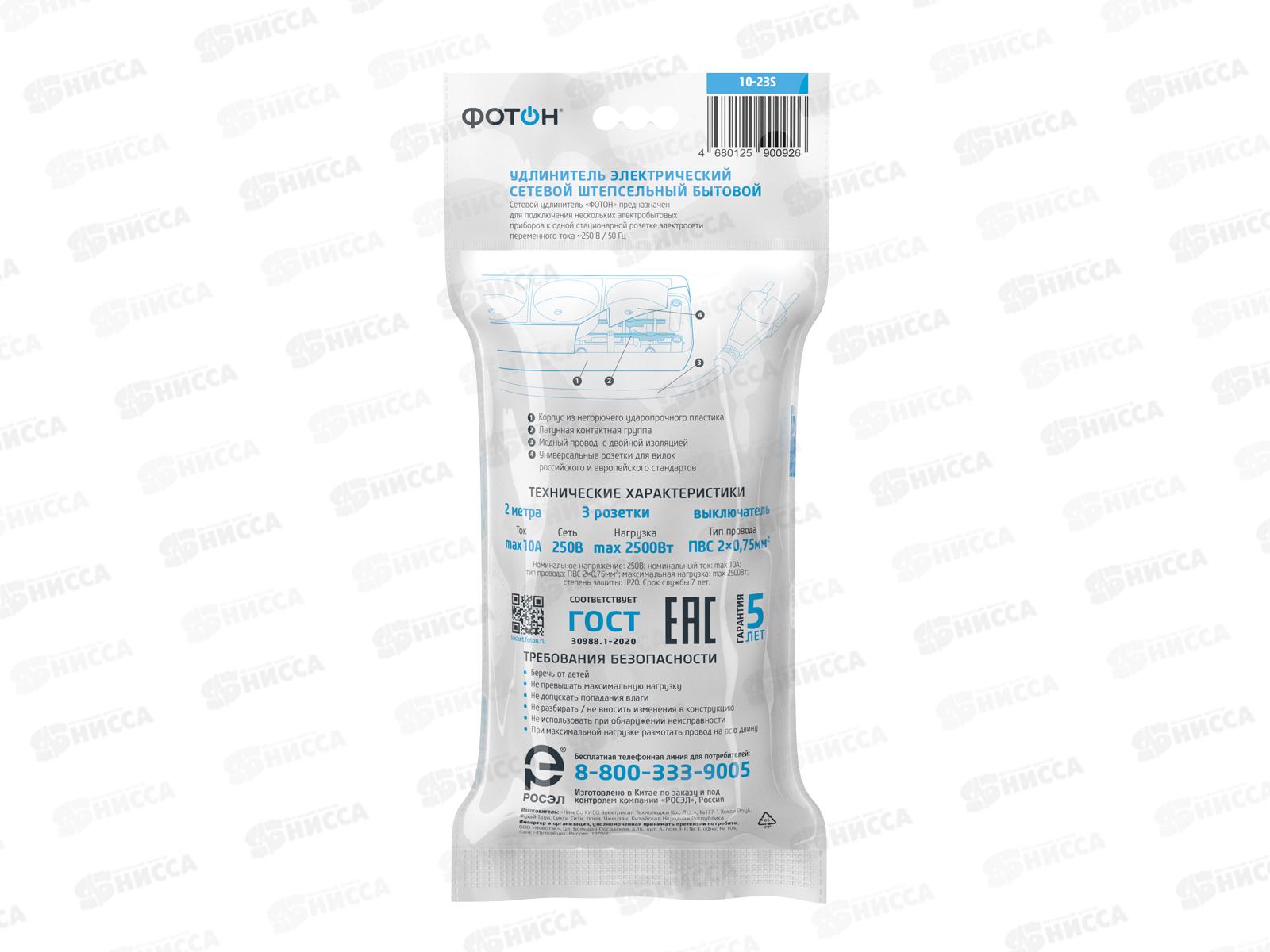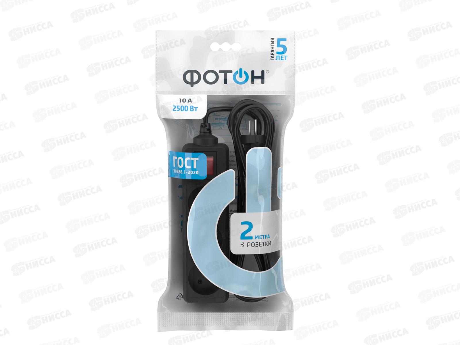 Удлинитель ФОТОН 10-23S 2м 3розетки 10А выключатель, черный *20