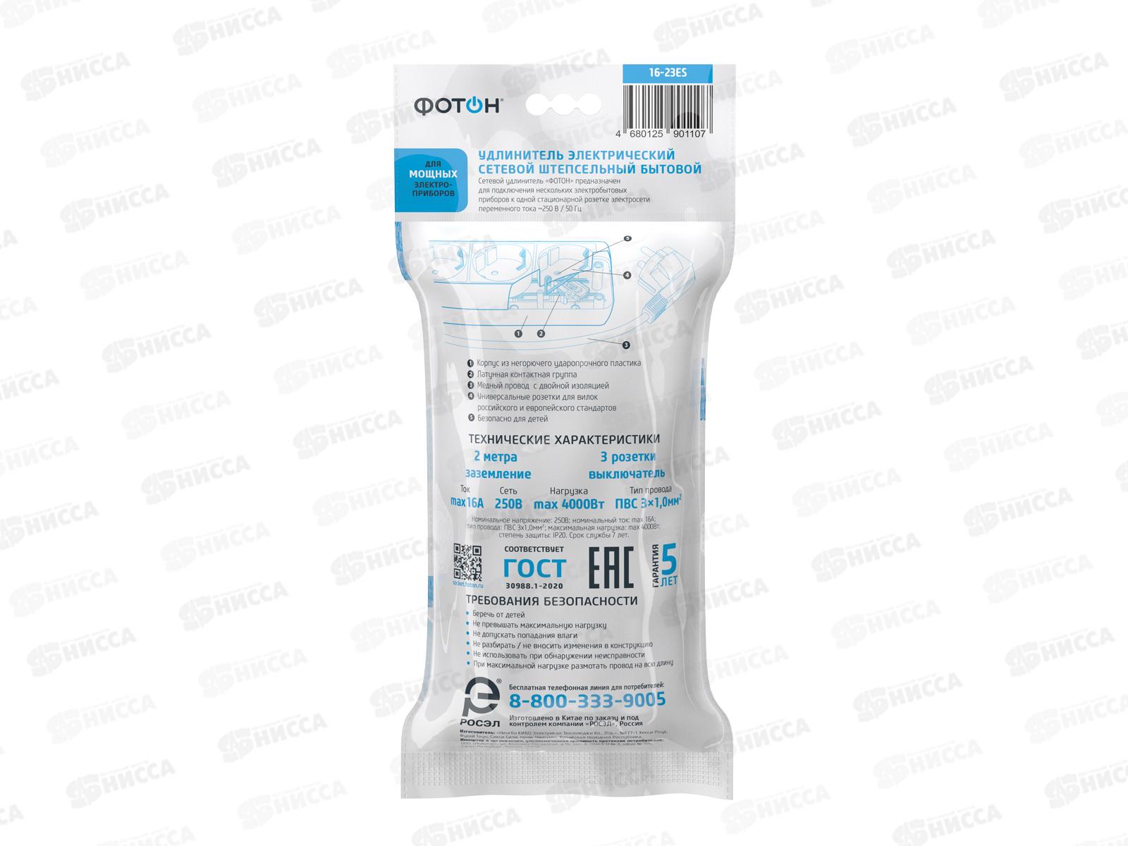 Удлинитель ФОТОН 16-23ES 2м, 3розетки 16А выключатель, с заземлением, белый *20