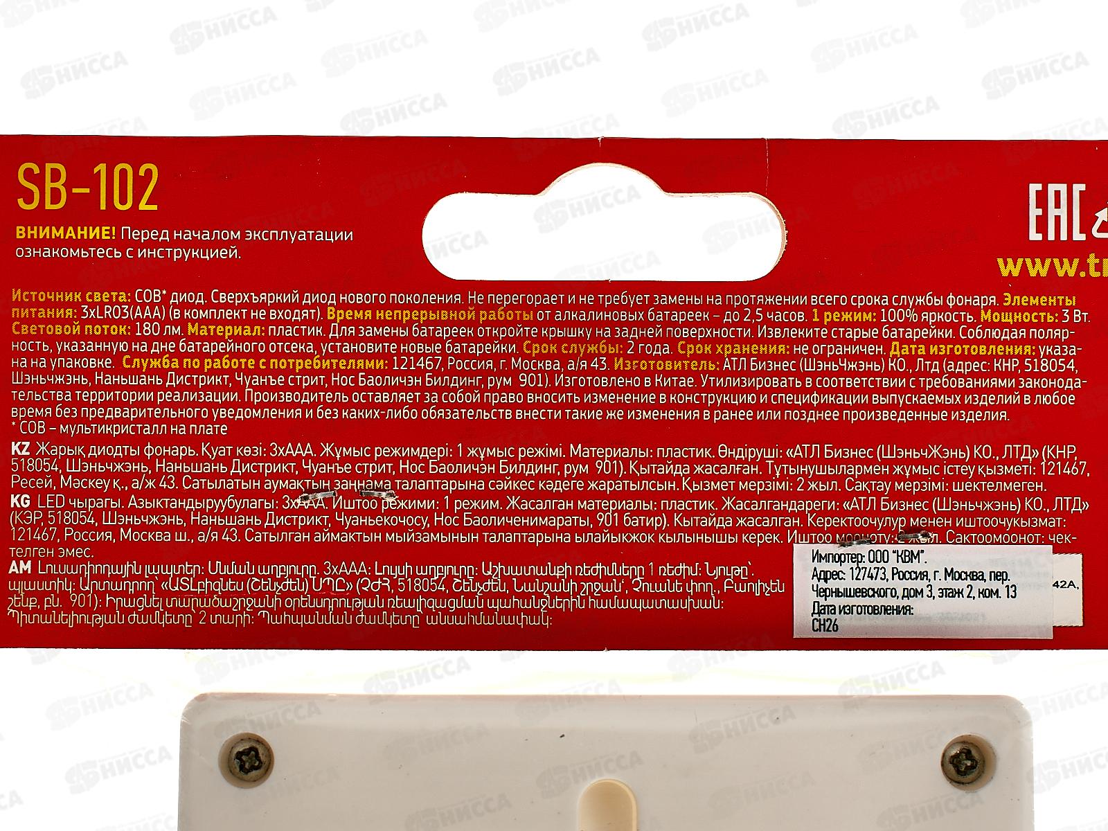 ТРОФИ SB-102 - светодиодный фонарь-подсветка в форме выключателя. Прост в установке и удобен в применении. Два типа крепления - ушко для подвешивания и двойная липучка для монтажа без сверления. Работает от 3 мизинчиковых батареек (3 х ААА). Дает возможность организовать яркую подсветку в любом месте - без привязки к электросети. Включается нажатием на корпус - как обычный выключатель. На кнопке "выключателя" расположена светодиодная плата - именно она создает качественный заливающий свет. Применена новейшая LED-технология - сверхъяркие и суперэкономичные светодиоды COB. Бытовой фонарь-подстветка в аккуратном лаконичном корпусе базового белого цвета универсален для любого интерьера.