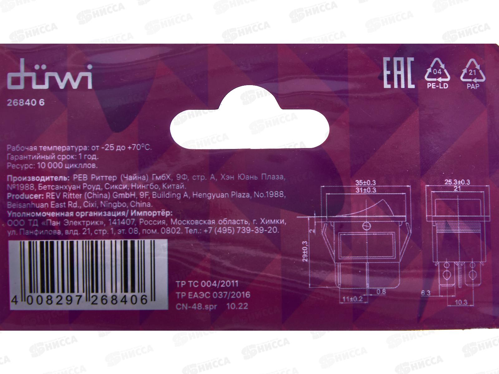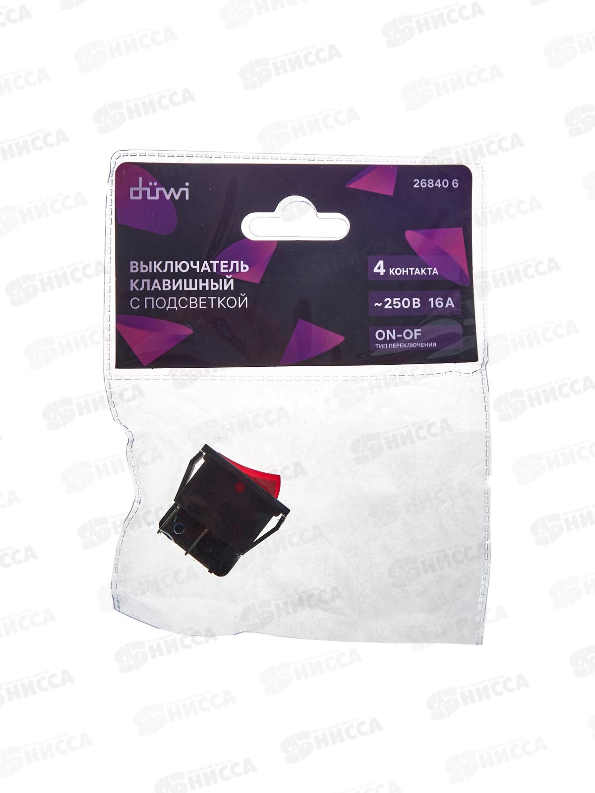 Выключатель клавишный красный с подсветкой ВКЛ-ВЫКЛ 4контакта 250В 16А прямоугольный 26840 6