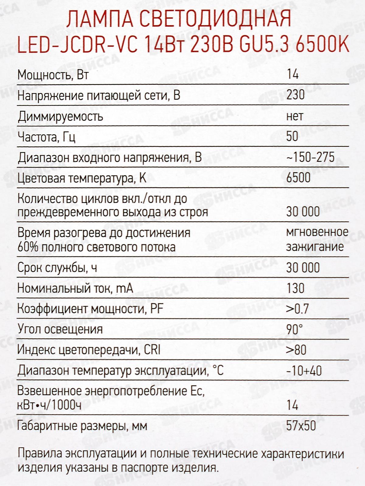 Лампа светодиодная IN-HOME LED-JCDR-VC 14Вт GU5.3 6500К 1260Лм *100