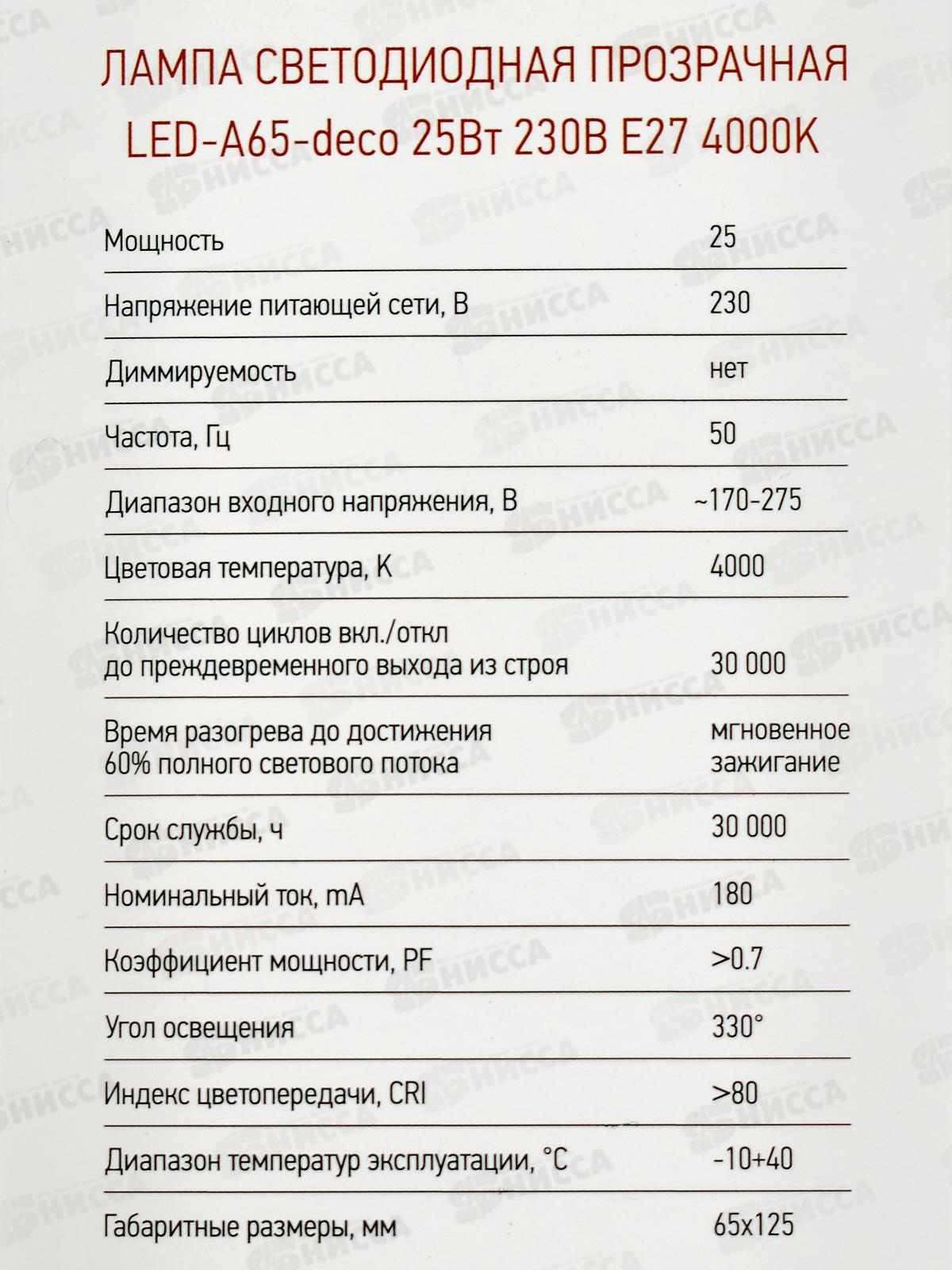 Лампа светодиодная IN HOME LED-A65-deco 25Вт E27 4000К 2480Лм *10