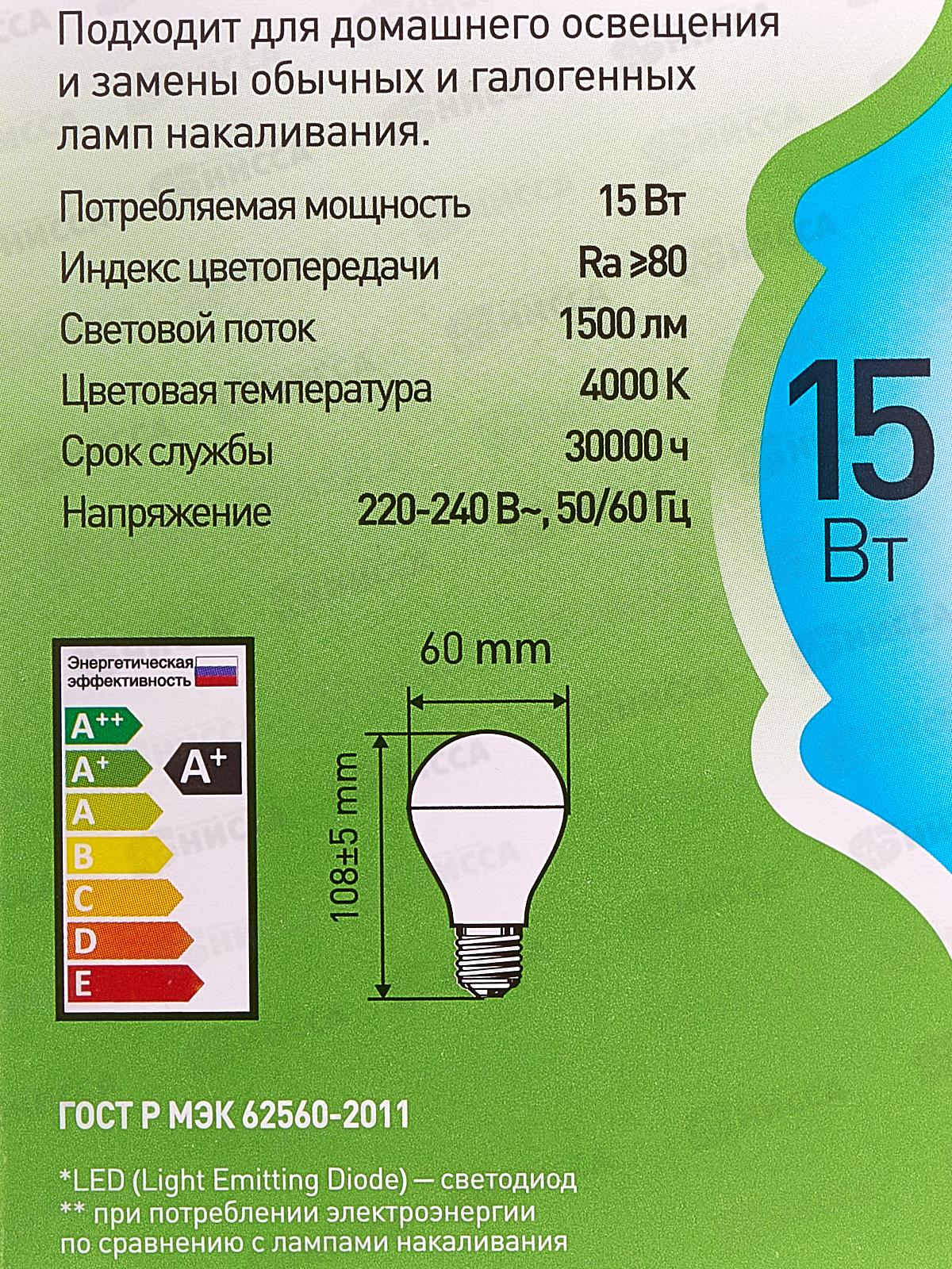 Лампа светодиодная ЭРА GREEN LINE LED 15Вт 4000К, A60-15W-840-E27 *10/100