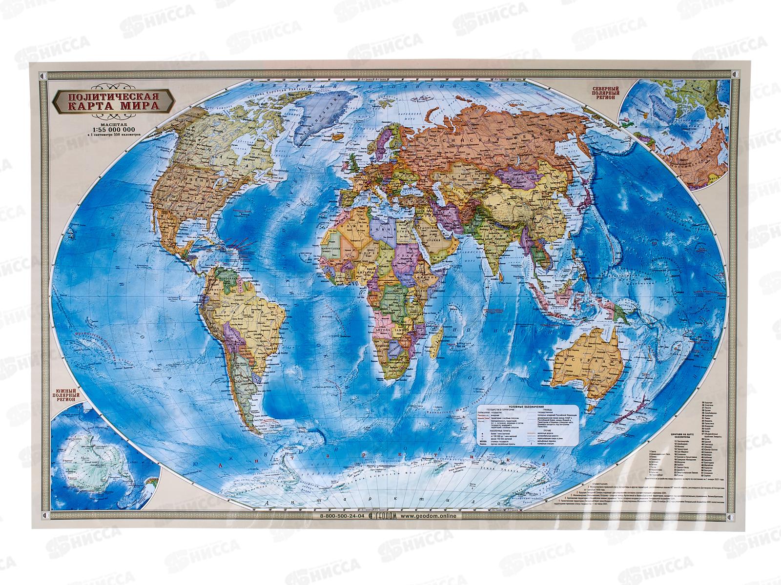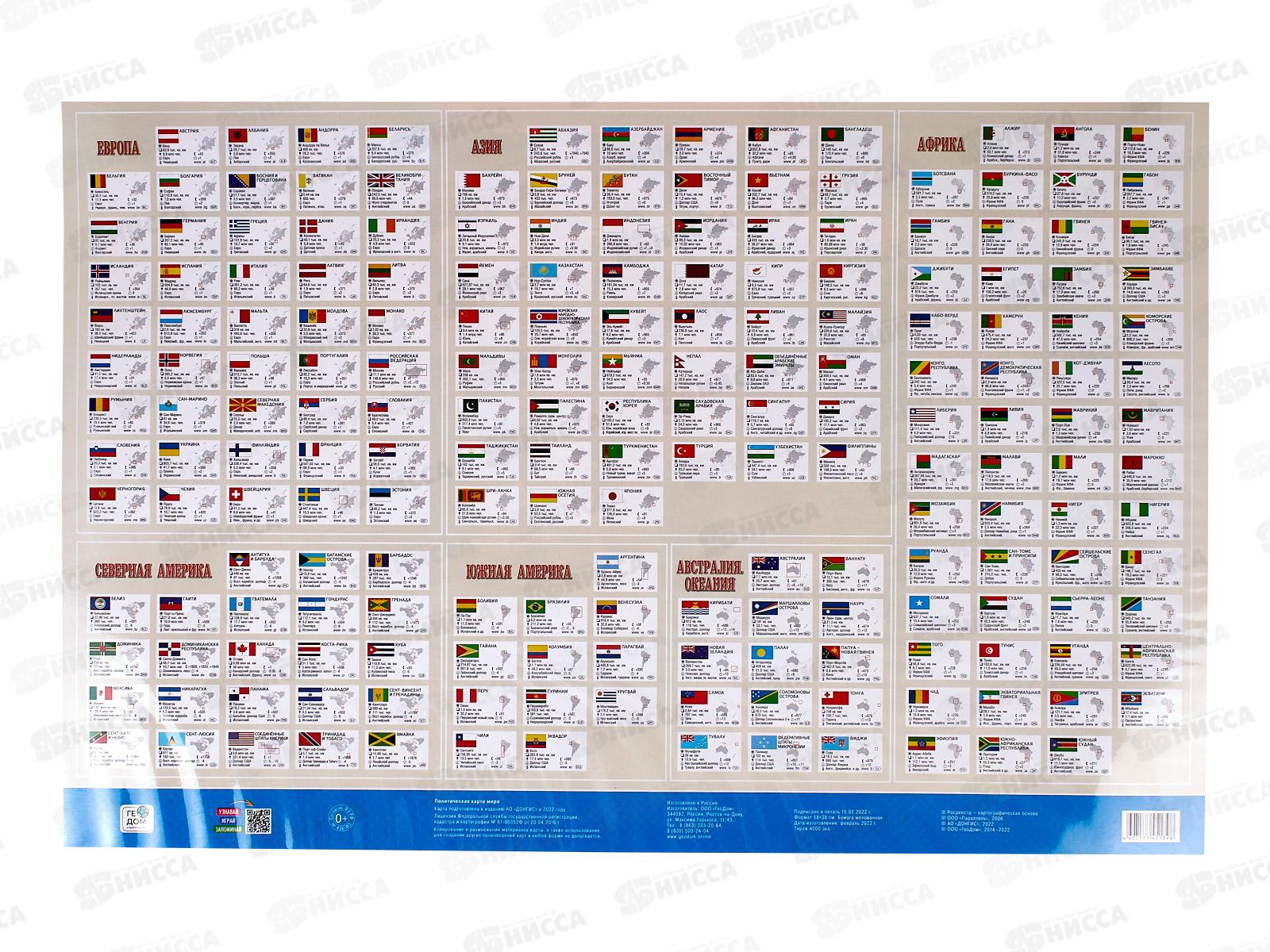 Карта политического мира подробно отражает современное политико-административное устройство мира и границы государств. Территории государств выделены цветом. Населённые пункты отображены по числу жителей и административному значению, показаны основные наземные пути сообщения и судоходные каналы. Особенность данной карты в том, что на ней, помимо геополитической информации, размещена символика государств мира. Государственные флаги стран мира сгруппированы по каждому континенту.