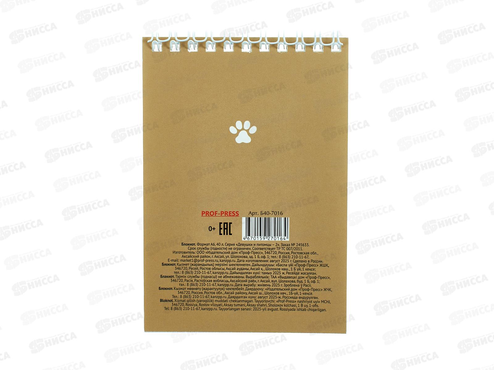 Блокнот ПП 40л А6 Девушки и питомцы - 2, ассорти, гребень, клетка, Б40-7016