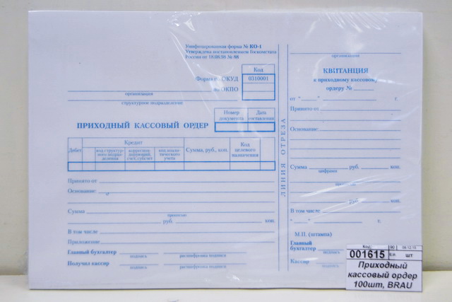 Тип бланка: Приходный кассовый ордер