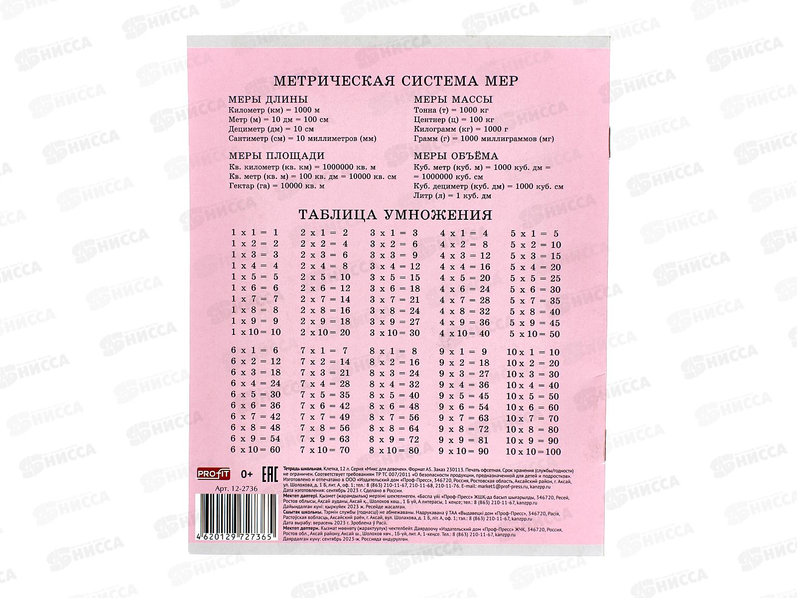 Тетрадь 12листов клетка Profit Микс для девочек, 5дизайнов, 12-2736 *25/250
