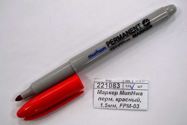 Маркер перманентный MunHwa FPM-03 для письма по бумаге, металлу, пластику, керамике, коже и другим поверхностям. Яркий насыщенный красный цвет чернил. Время высыхания 30-40 секунд. Рабочая температура от -15° до 50°.