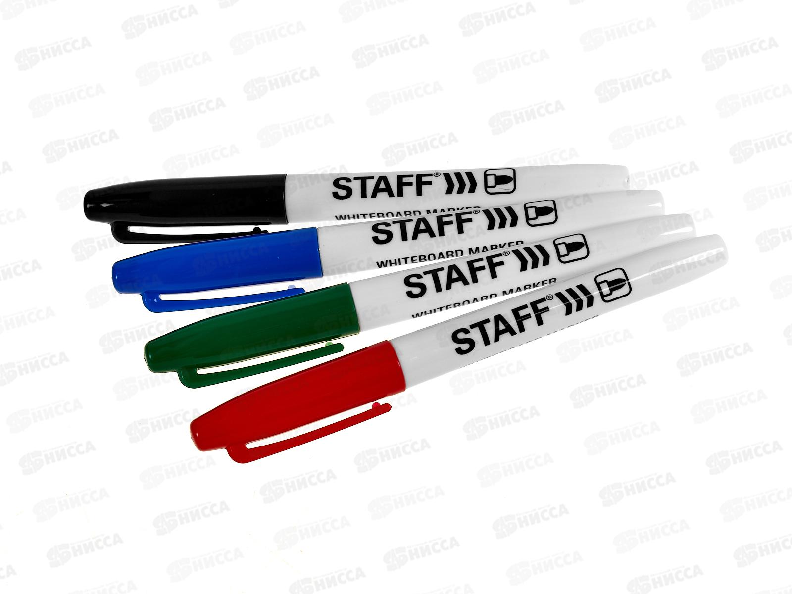 Набор маркеров для белой доски Staff, 151097. Подходят для письма и рисования на магнитно - маркерных и стеклянных досках. Износоустойчивый круглый наконечник обеспечивает четкую линию и идеальное качество письма. Чернила на спиртовой основе легко стираются сухой губкой или салфеткой. В наборе 4 насыщенных цветов - черный, синий, красный, зеленый.
