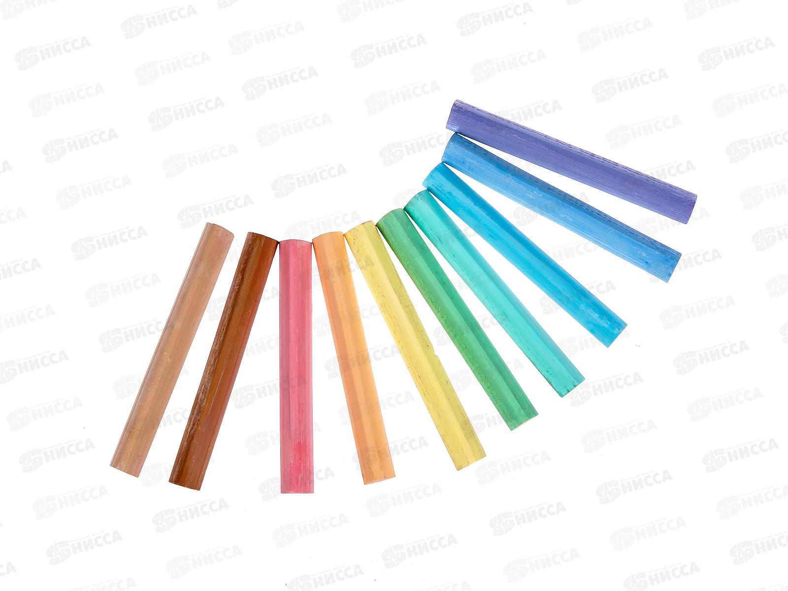 В упаковке 10 штук в 10-ти цветах: красный, голубой, синий, зеленый, светло-зеленый, желтый, фиолетовый, коричневый, светло-коричневый, оранжевый. Удобная треугольная форма и мягкое письмо. Мягкие мелки состоят на 95% из натурального мела и не содержат гипс. Мел удобно лежит в руке, не царапает рабочую поверхность и не пылит при письме. Не имеют выраженного запаха. Следы мелков легко очищаются с рук. Набор упакован в картонную коробку с европодвесом.