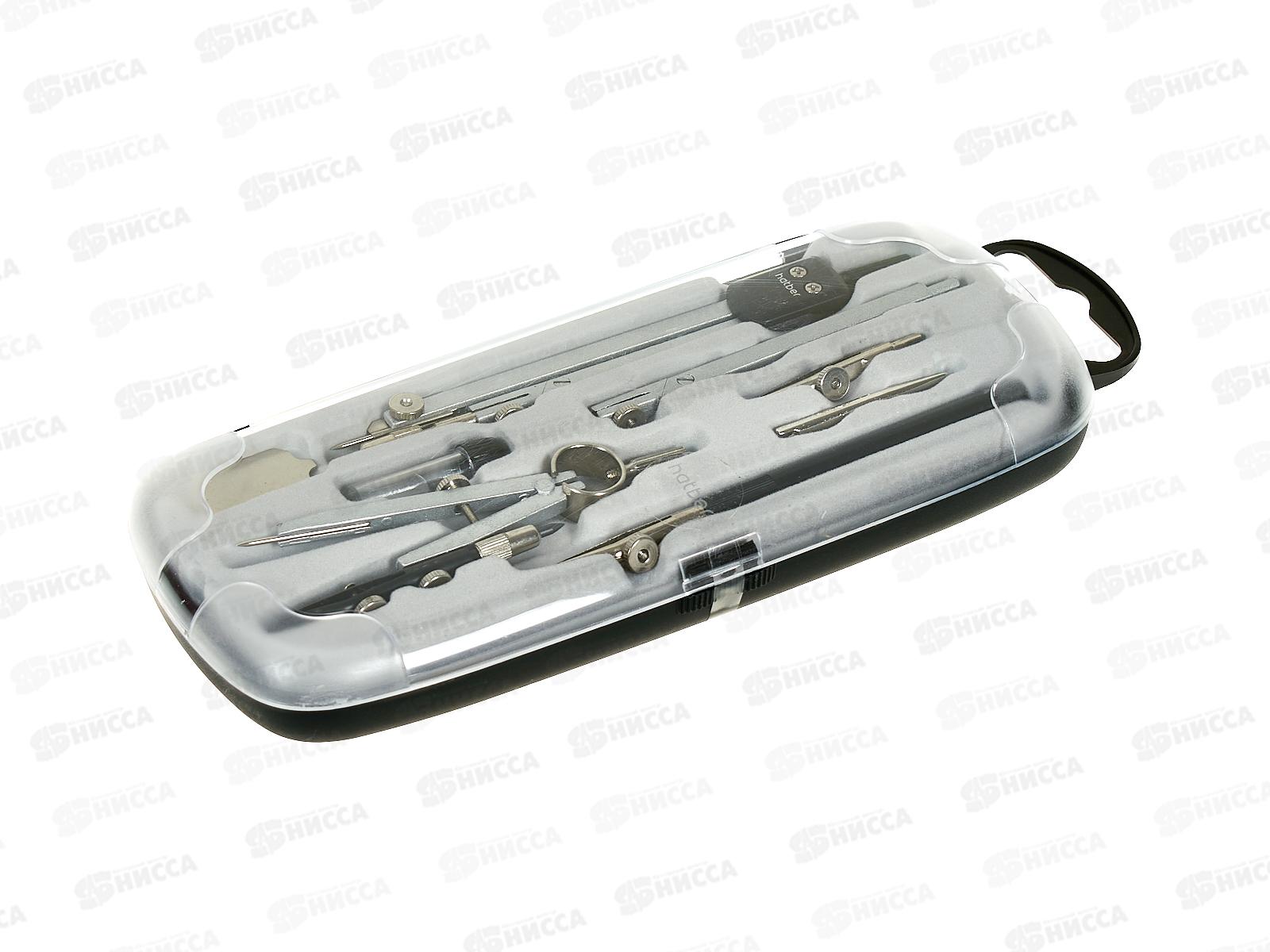 Металлические части чертежного инструмента ТМ Hatber изготовлены из цинка, надежный соединительный механизм позволяет выдерживать многократные циклические нагрузки. Готовальня упакована в пластиковый пенал с прозрачной крышкой, оснащена европодвесом для расположения на специальных стойках с навесными крючками. Предназначена для учеников старших классов и студентов. Наполнение из восьми предметов: циркуль, удлинитель для увеличения радиуса циркуля, рейсфедерная вставка, точечная насадка, рейсфедер, кронциркуль, отвертка и пенал с запасным грифелем.