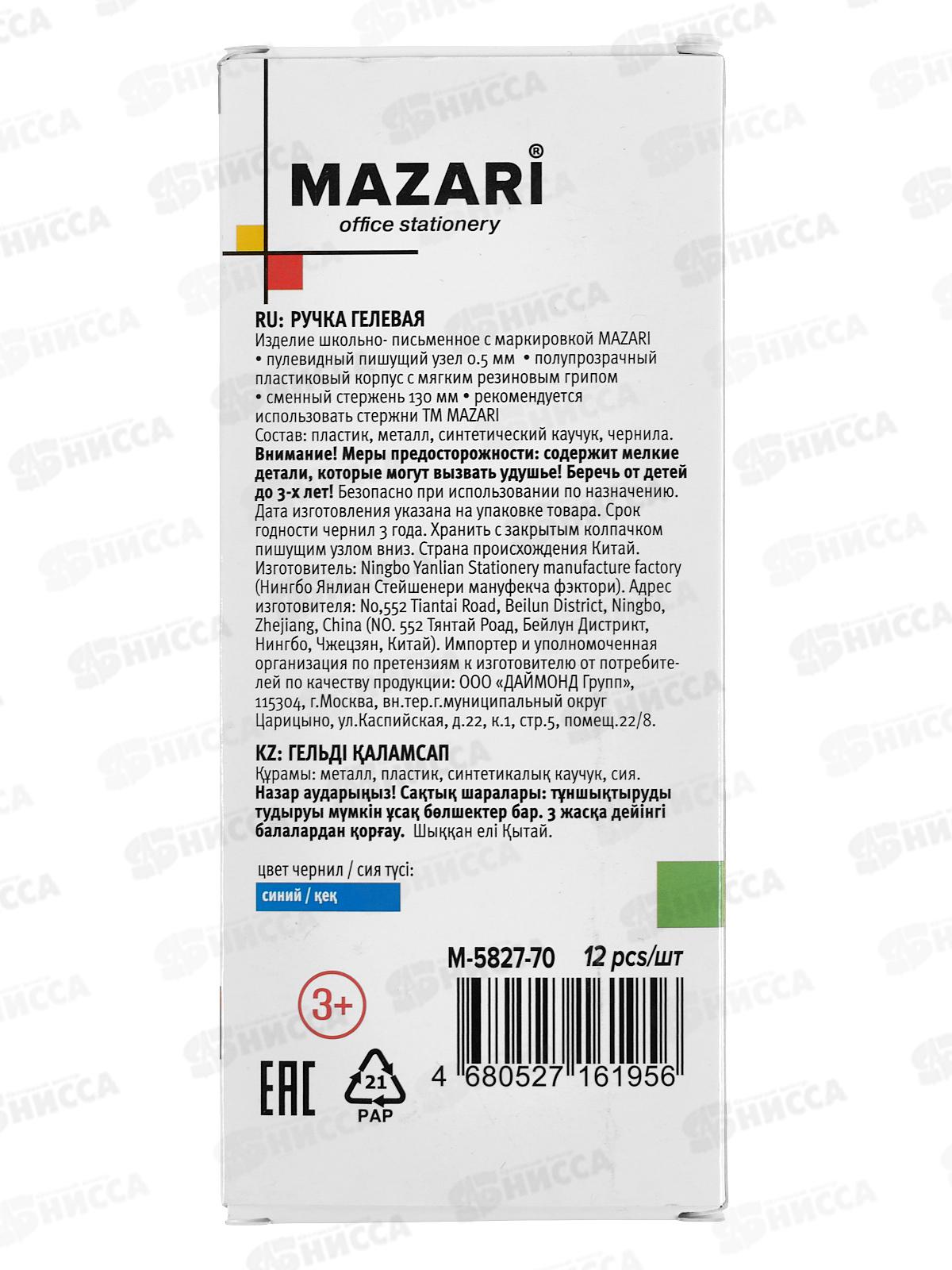 Ручка гел. MAZARI Cielo 0.5мм, п/прозр.корп., синяя. M-5827-70 *12/144