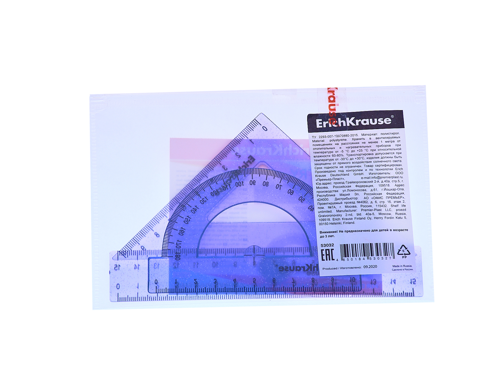 Набор геометрический полупрозрачный из высококачественного пластика. В комплекте 3 предмета: линейка с двухсторонней шкалой 15см, угольник 9см/45°, транспортир 180°/10см.