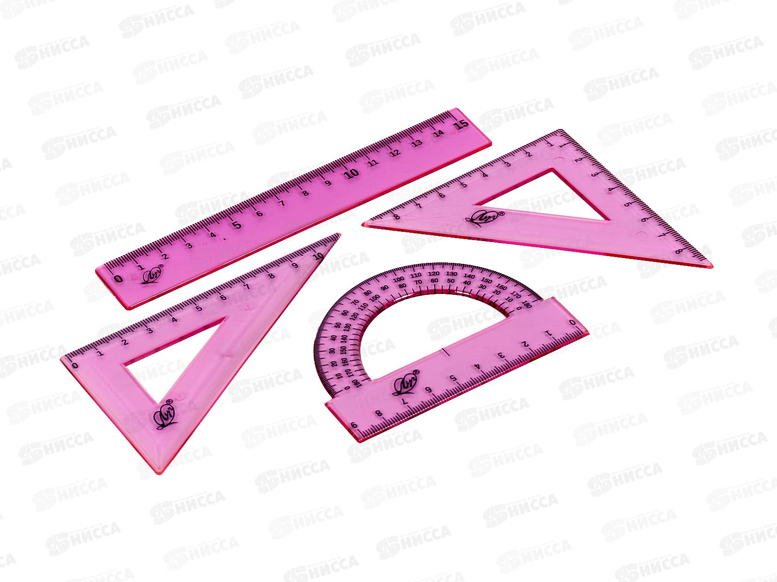 Геометрический набор линеек ЛУЧ предназначен школьникам, студентам, сотрудникам офисов - всем, кто работает с чертежами, таблицами и рисунками. Линейки изготовлены из высококачественного пластика. Четкая печать односторонней шкалы. Упаковка: прозрачный пакет с подвесом.