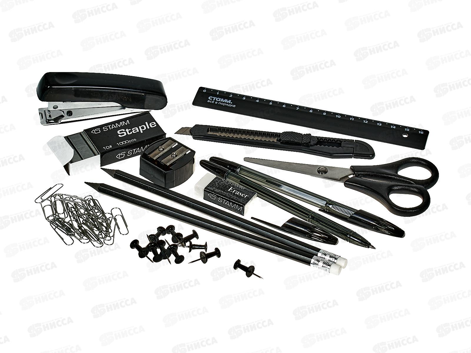 Набор канцелярских принадлежностей Стамм предназначен для удобного хранения канцтоваров на рабочем месте. Компактный органайзер выполнен из качественного полистирола, и свободно вращается на 360 градусов. Изделие представлено в чёрном цвете, и имеет 10 отделений под различные канцелярские предметы. Органайзер и наполнение упакованы в картонную коробку. В состав набора входят: 2 шариковые ручки, 2 чернографитных карандаша, степлер для скоб № 10, скобы № 10, ножницы, канцелярский нож, точилка, ластик, линейка, скрепки 30 шт. и кнопки 10 шт.