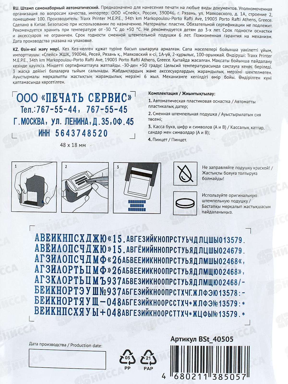 Комплектация: касса шрифта, пинцет, сменная подушка
