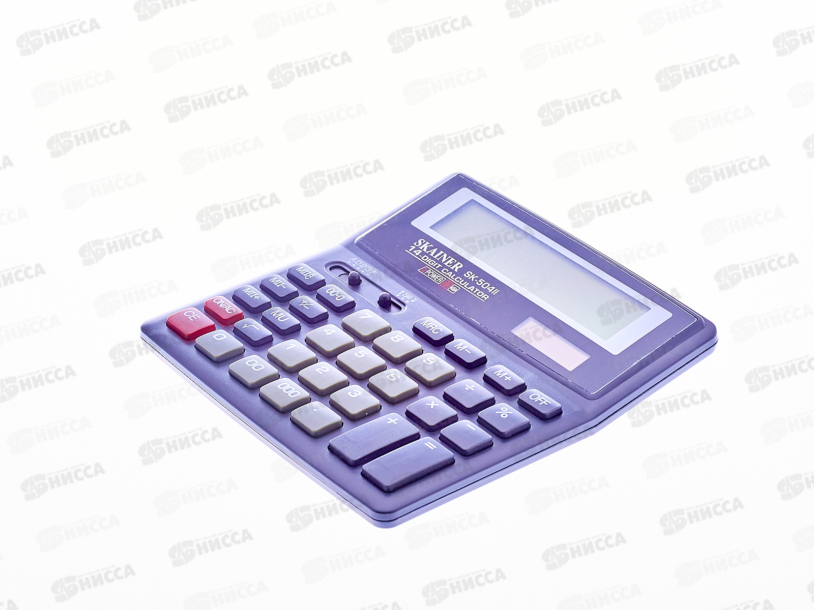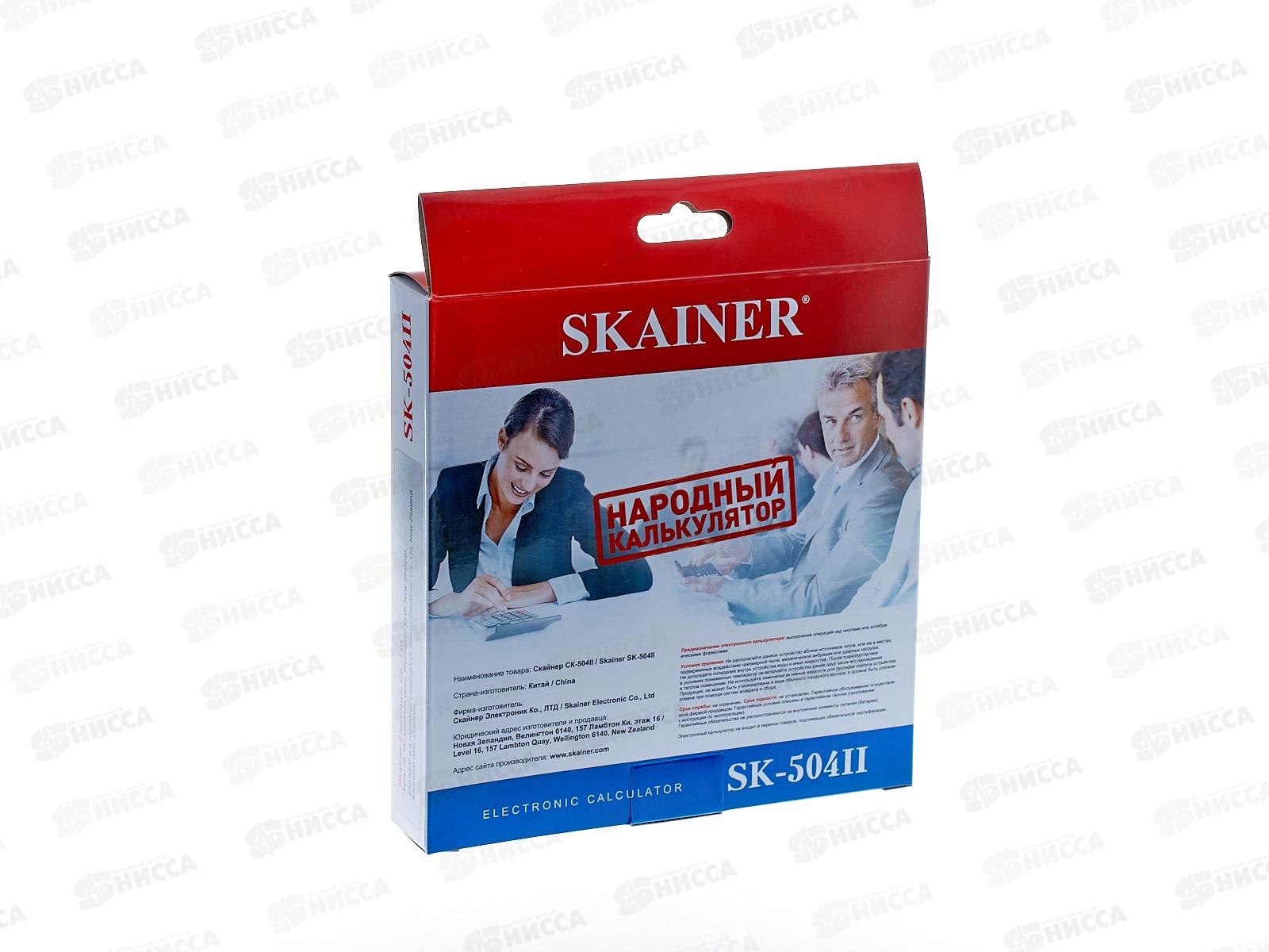 Калькулятор Skainer SK-504II, 14-ти разрядный, с ЖК-дисплеем. Имеет независимую память, 2 ячейки, функцию надбавки (повышения цены). Так же в калькуляторе имеется операция изменения знака числа, клавиши ввода «00» и «000» и удаления последней отображаемой цифры, ползунковый переключатель режима запятой и режима округления, пластиковые клавиши, функция быстрого ввода. Литиевая и солнечная батарея питания. Автоматическое выключение питания.