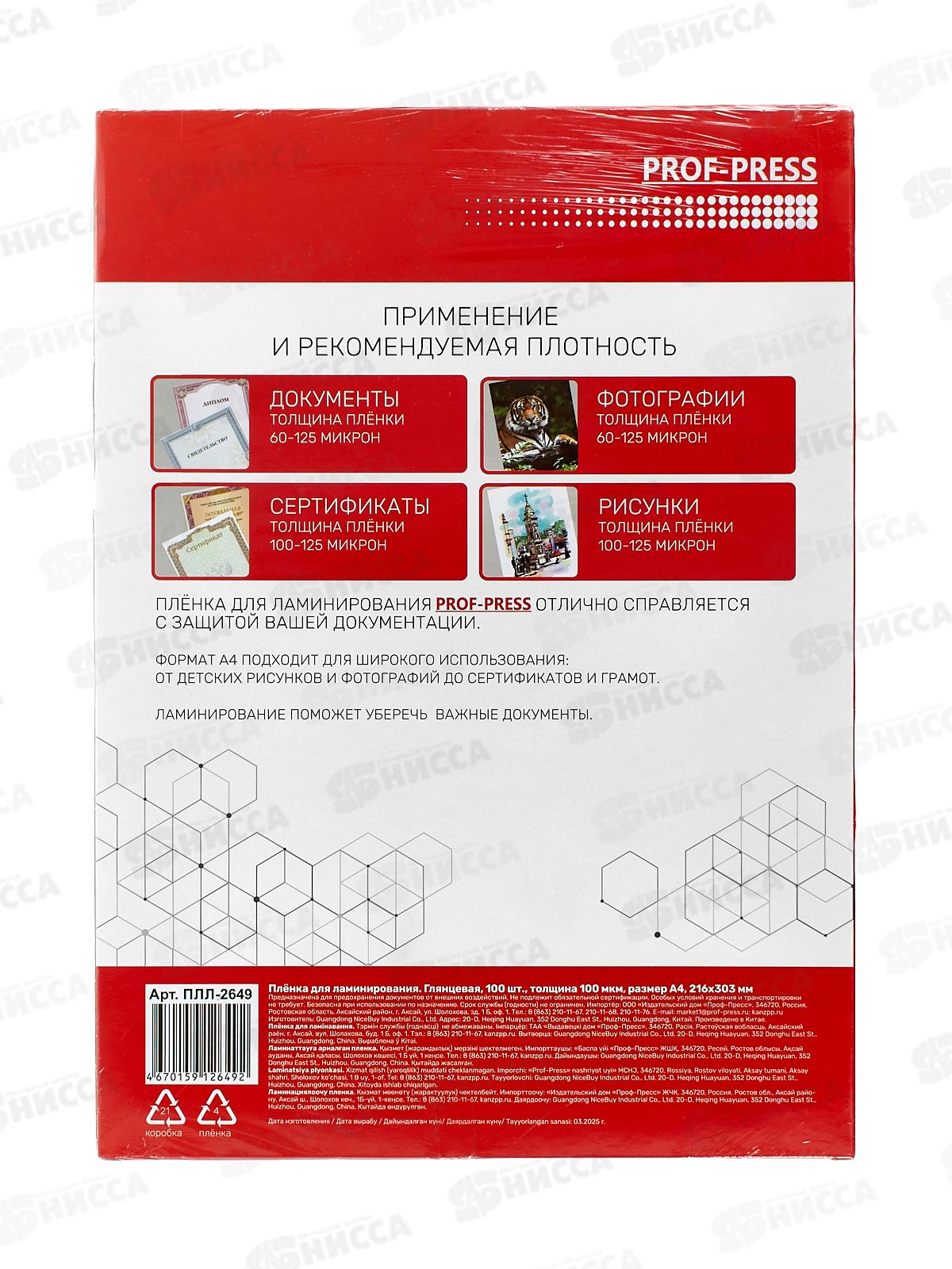 Пленка для ламинирования ПП А4 100мкр, 216*303мм, 100шт, глянцевая, ПЛЛ-2649 *10