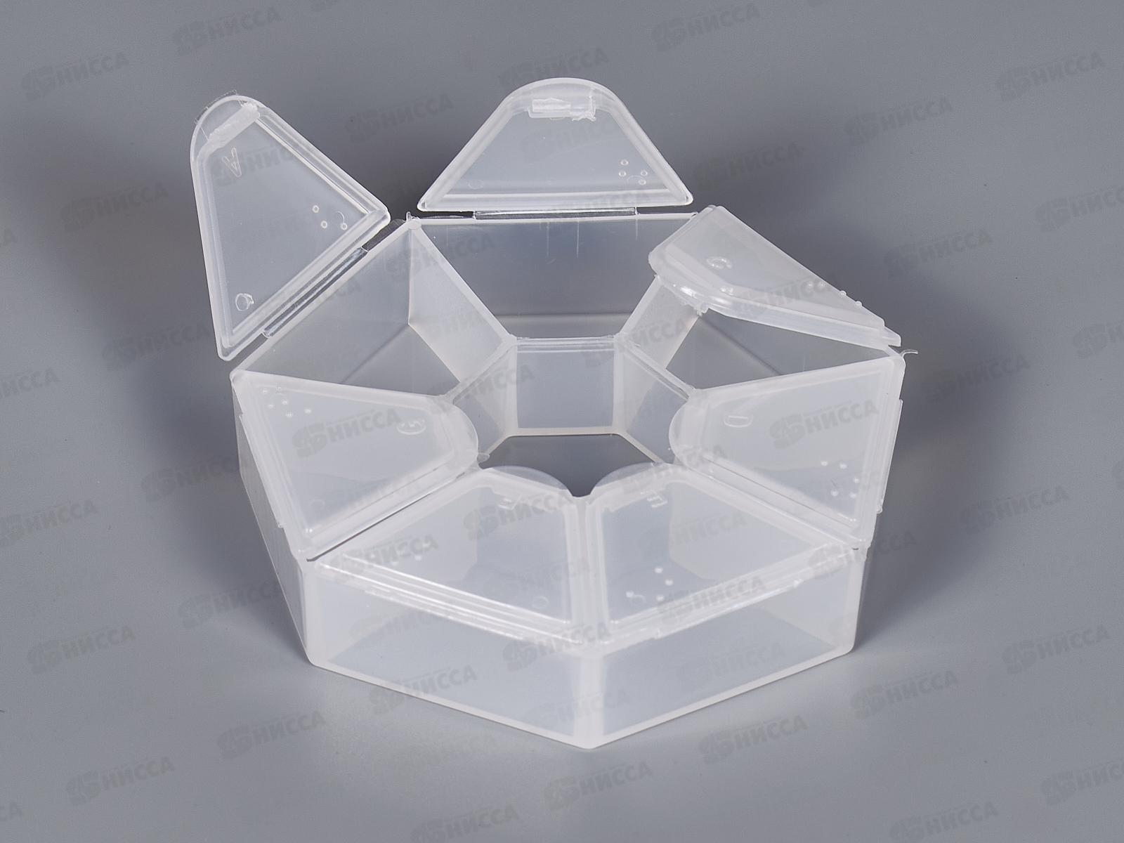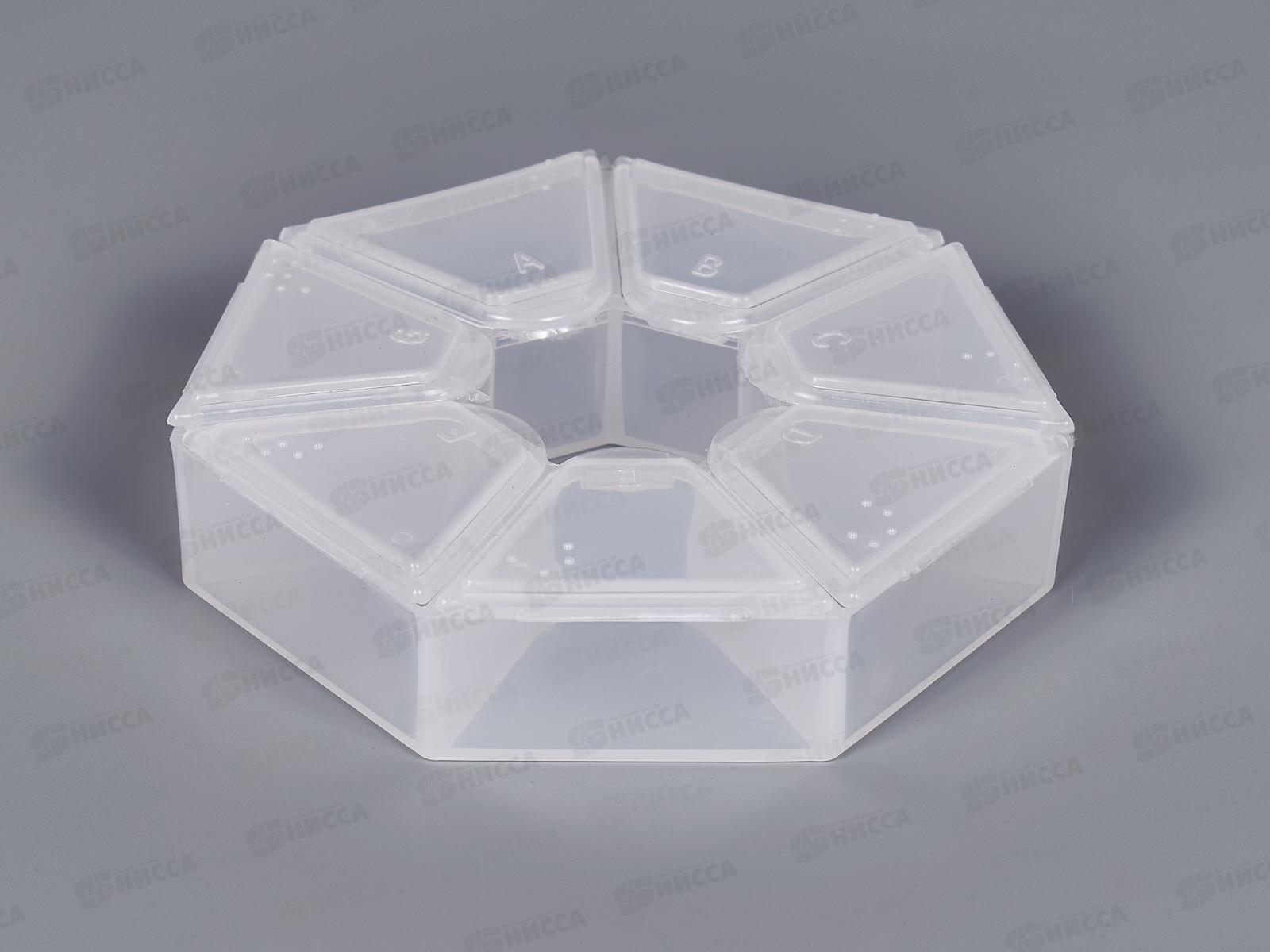 Контейнер секционный круглый со съемными защелкивающимися крышками. На секциях указаны буквы и шрифт Брайля для слабовидящих и слепых людей. Применяется для хранения бисера, мелкой фурнитуры, аксессуаров для шитья и рукоделия.