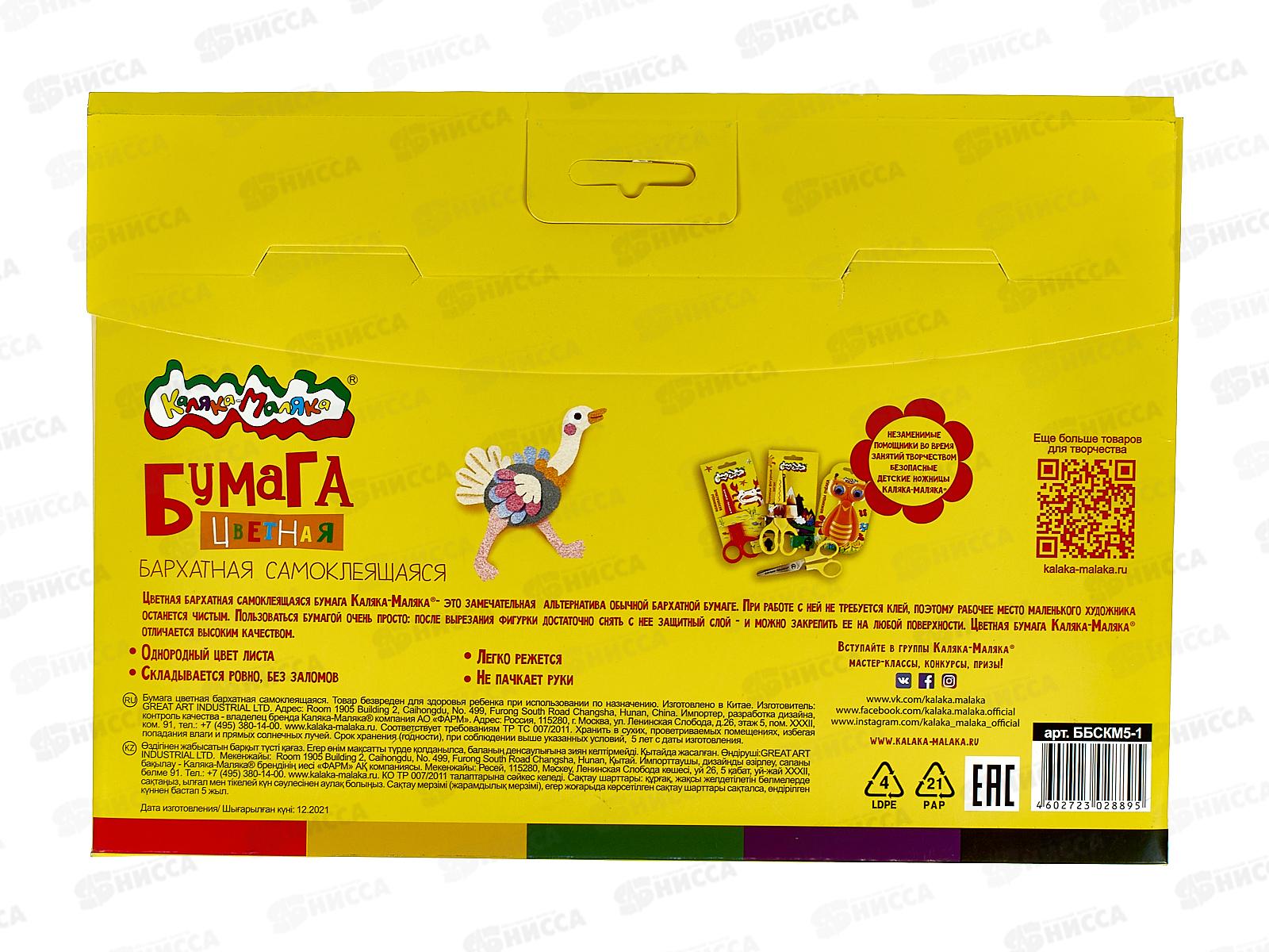 Цветная бумага самоклеющаяся бархатная 5листов 5цветов Каляка-Маляка 175*250, ББСКМ5-1 *100