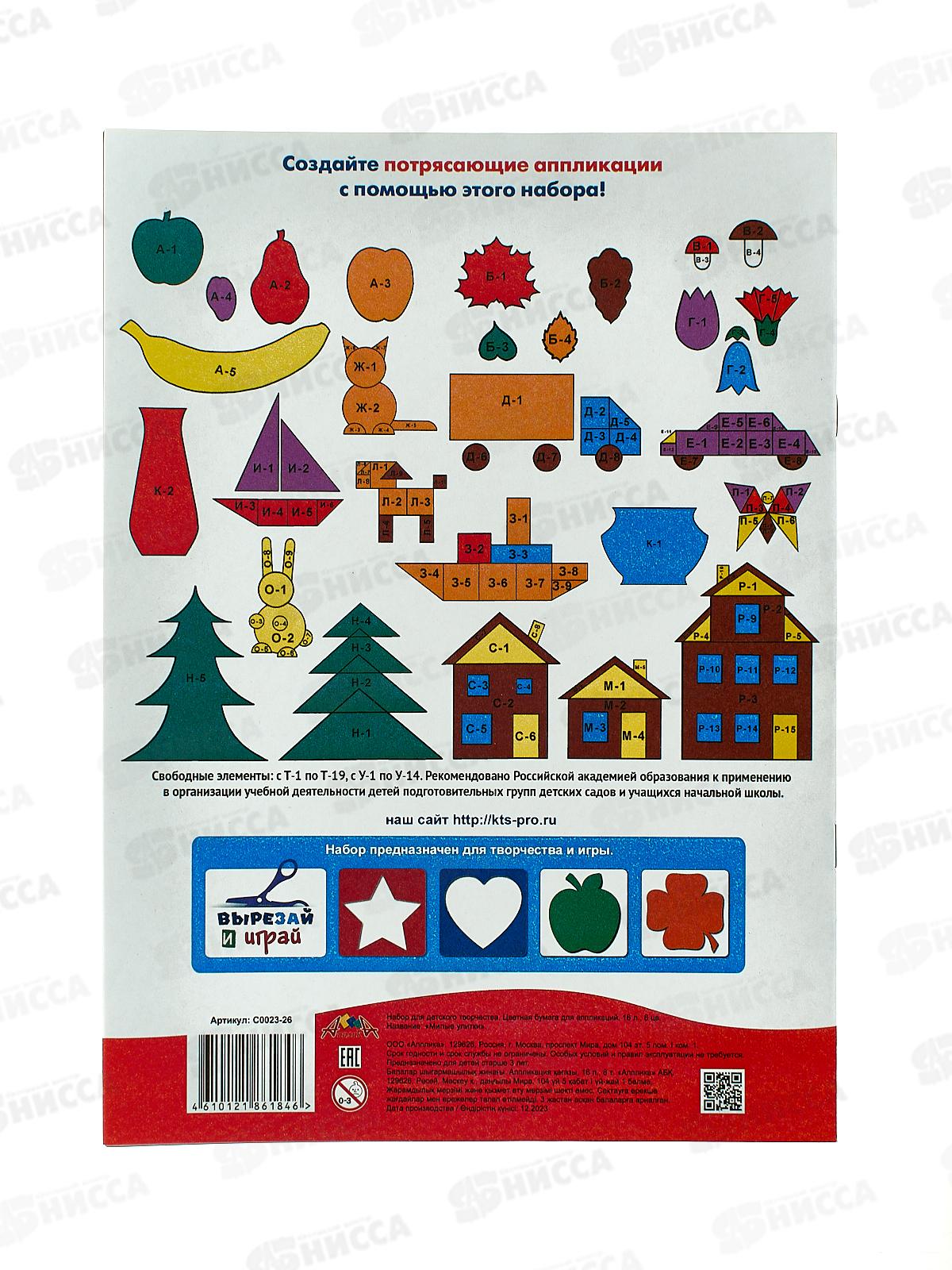 Цветная бумага для аппликаций, 16 листов, 8 цветов, формат А4, плотность 50 гр/м2. Внутренний блок - офсет №2, двойной прокрас с одной стороны. В наборе цвета: желтый, коричневый, голубой, сиреневый, черный, оранжевый, красный, зеленый. Каждый лист с одной стороны окрашен в цвет, а на обороте напечатаны контуры различных фигур для вырезания. Крепление - скоба, обложка - офсетная бумага. Рекомендуется детям от 3 лет.