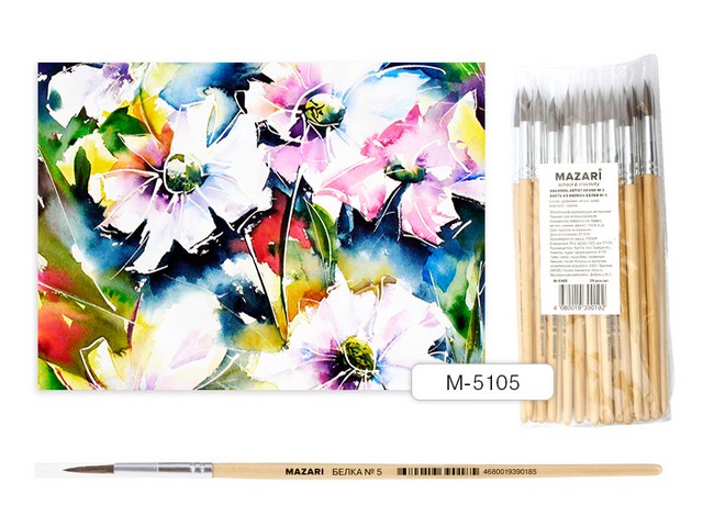 Кисть №5 от торговой марки Mazari М-5105. Вид ворса белки чрезвычайно мягкий и упругий, прекрасно набирает воду и краску, хорошо отдает ее на бумагу, при этом не «полосит» и не портит ее. Кисти применяются в акварельной живописи по бумаге и в живописи по фарфору. При правильном использовании они достаточно долговечны. Поставляется без упаковки.